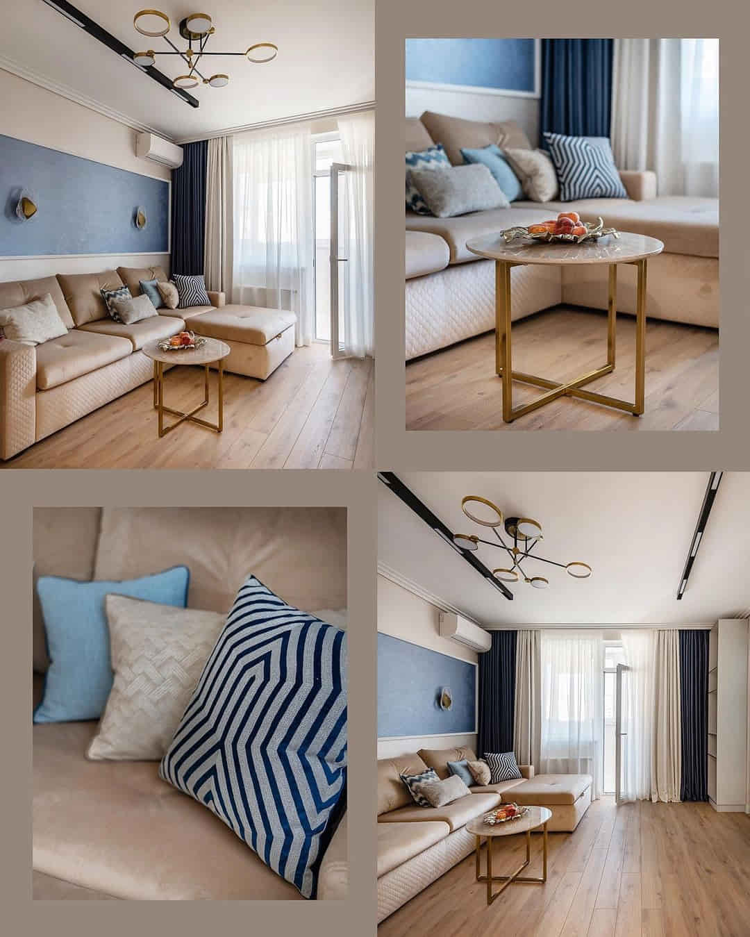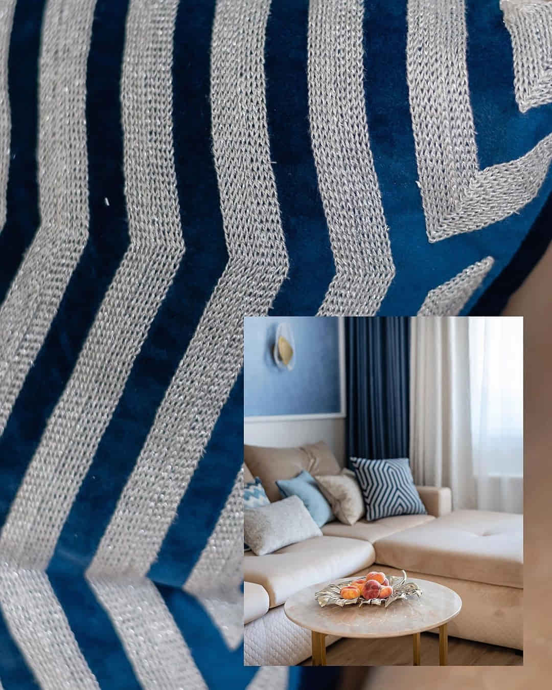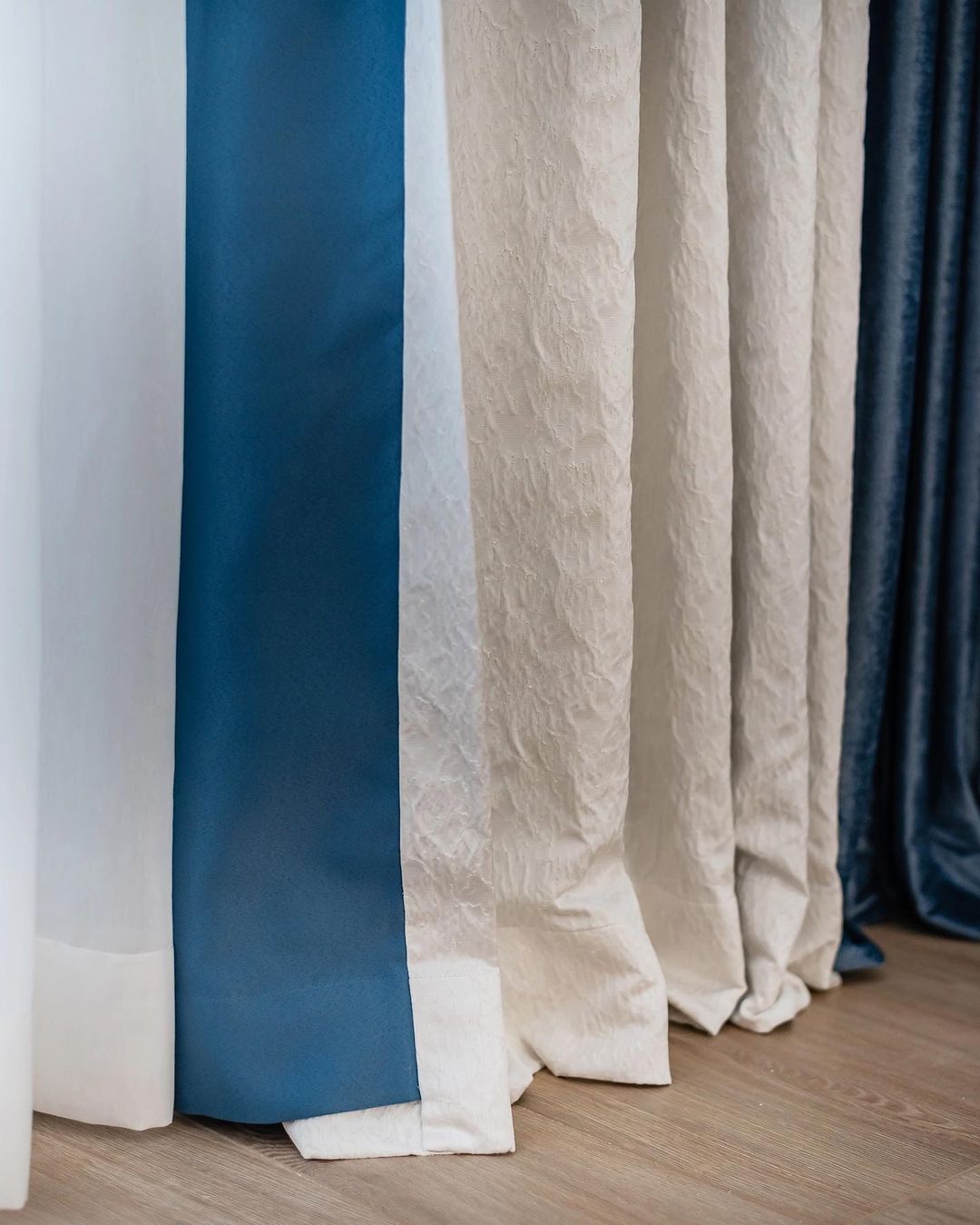 А еще шторы, в которых мы скомбинировали уютный мягкий шенилл с нарядным глянцевым жаккардом. И обратите внимание на контрастную темно-синюю подкладку: тот случай, когда и удобно, и эффектно)