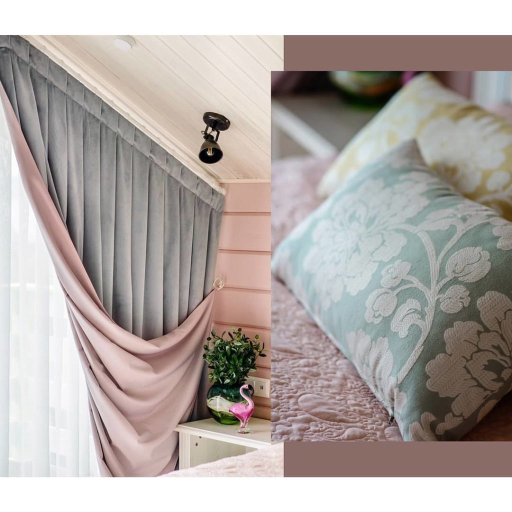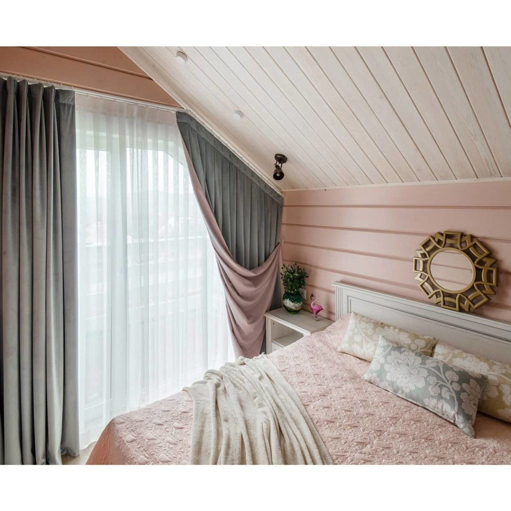 Шторы из мягкого бархата пошиты на цветной подкладке. И здесь тот случай, когда это более, чем оправданно. Заметили, что правая часть карниза установлена параллельно скатной крыше?