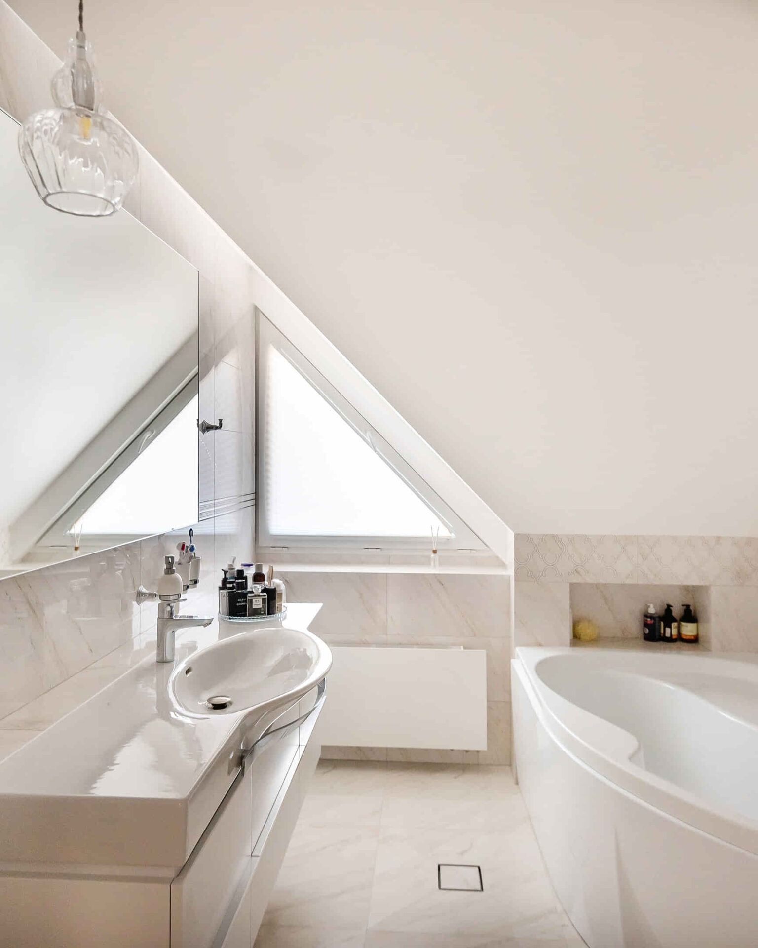 реугольные окна редко встречаются в практике Мисс Шторы, но уж если эта встреча состоялась, то в итоге точно будет что-то красивое Лаконичная ванная комната в проекте #миссштора_геометрия_пространства ...