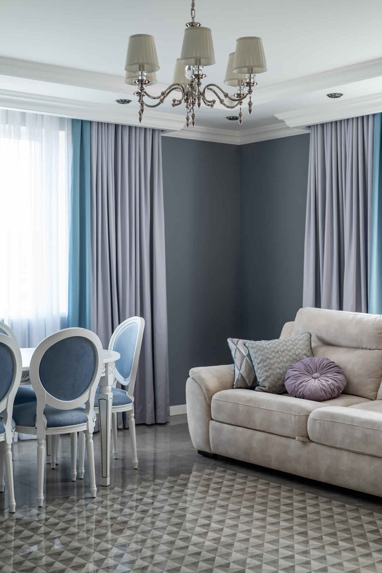 Благородный синий в сочетании с утонченным лавандовым — оба этих оттенка соединились в атласных шторах для гостиной в проекте #миссштора_геометрия_пространства И, конечно, разве можно обойтись в гостиной без большого сета ...