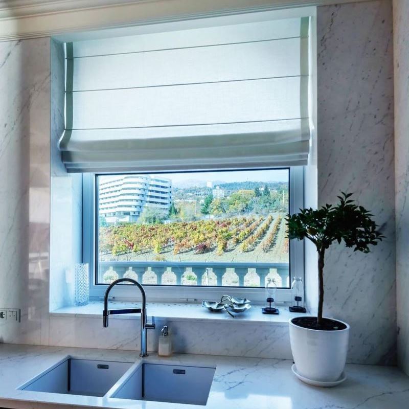 Роскошная белоснежная римская штора для кухни.