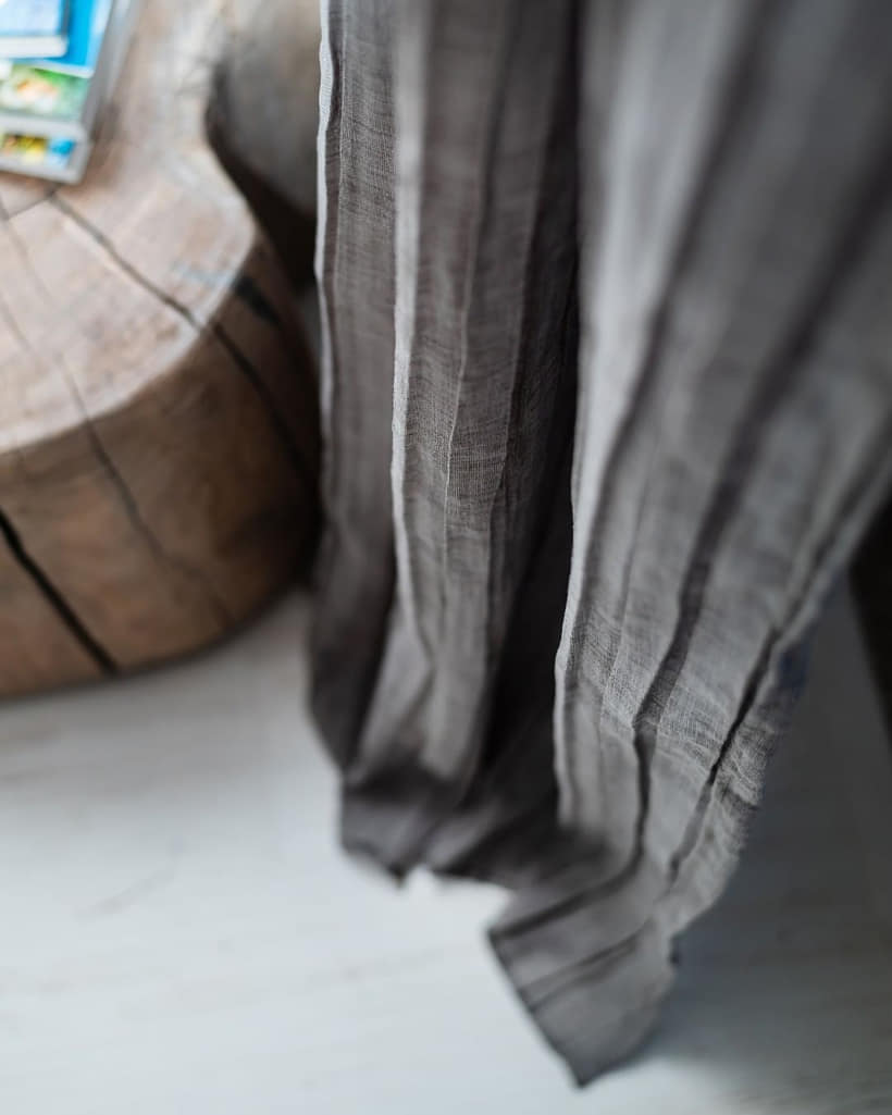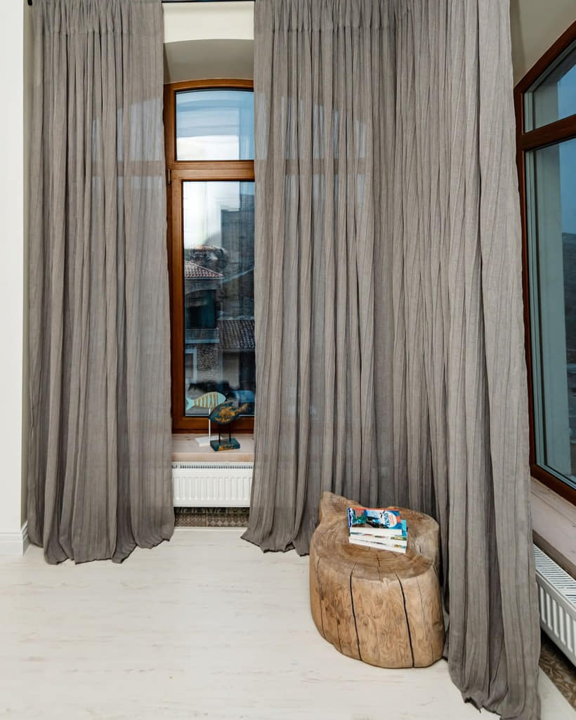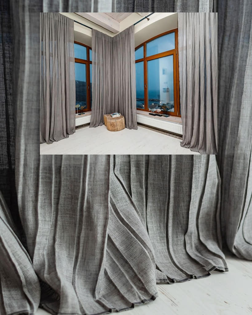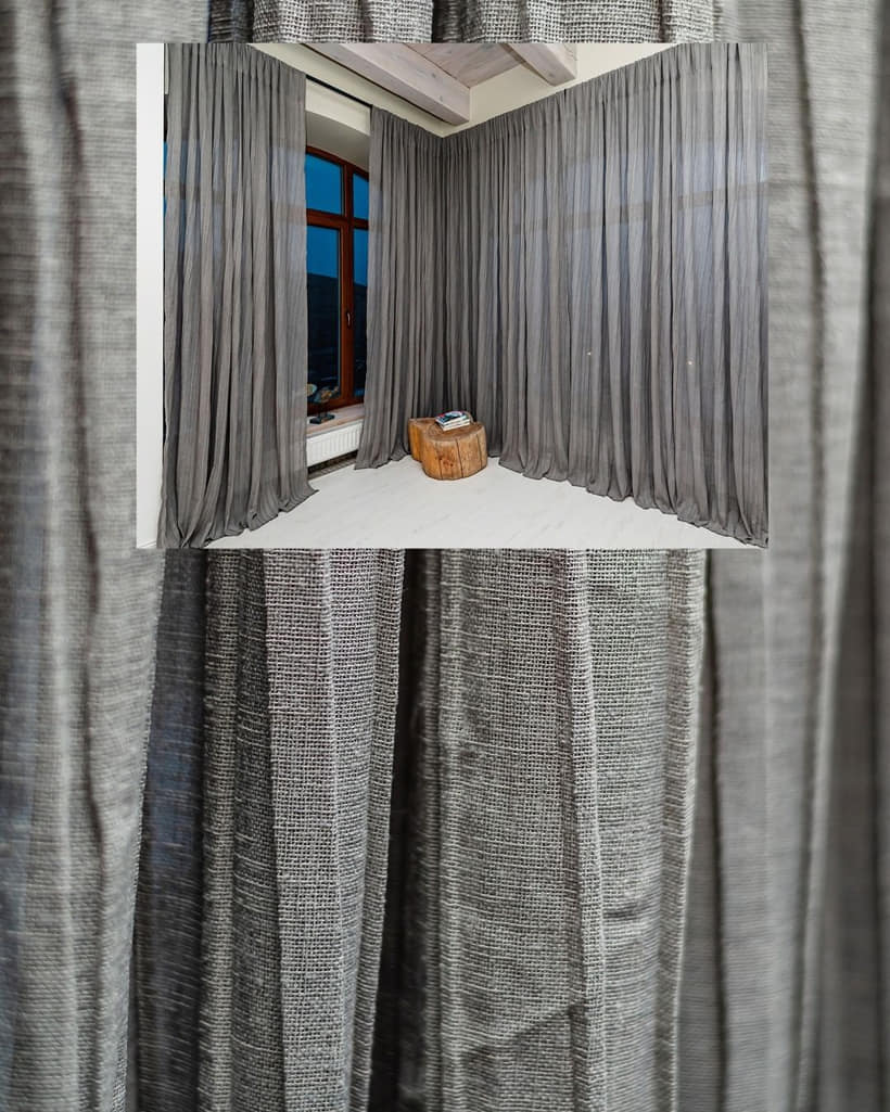 Полупрозрачные шторы с фактурой вертикального плиссе мы разместили на брутально-чёрном металлическом карнизе. Максимальная непринужденность считывается благодаря обработке верха портьеры, когда ткань словно обнимает карниз, ниспадая мягкими хаотичными складками. Это плавное движение ткани словно перетекает на пол, добавляя капельку роскошной небрежности.