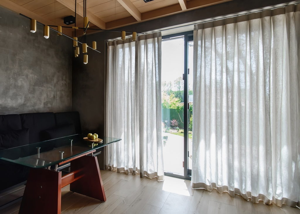 Большие панорамные окна не терпят нагромождения ткани. Но и совсем без текстиля их не всегда можно оставить. Для этой столовой мы подобрали ажурную ткань с крупным брутальным плетением и добавили ...