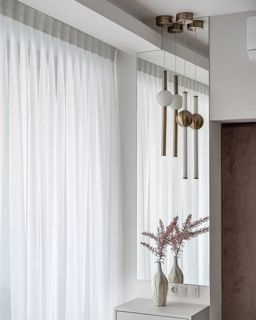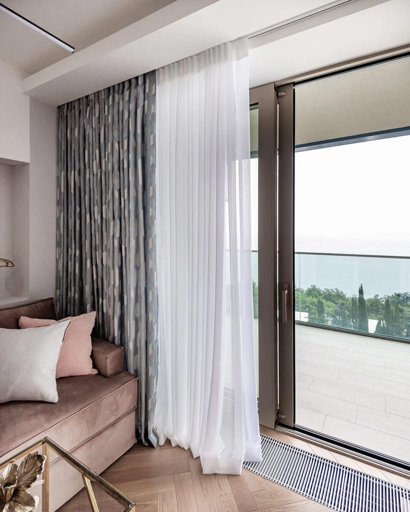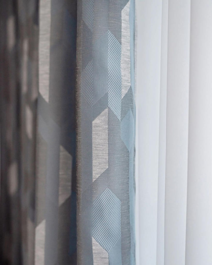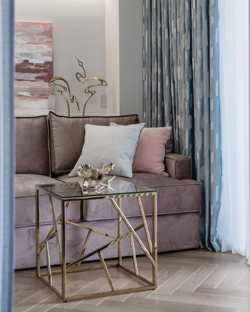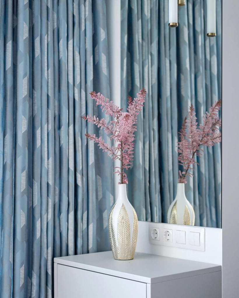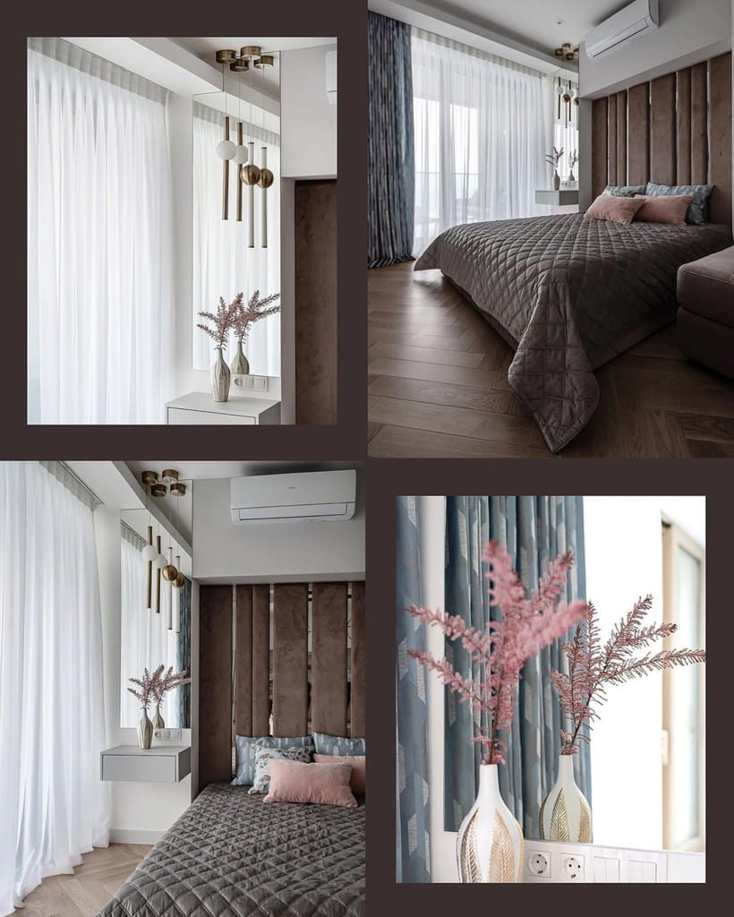 Серо-голубые шторы на контрасте с пудровым изголовьем кровати и диваном, создают иллюзию облаков в закатном солнце. В этот раз, что бы сохранить лёгкость и воздушность, мы не стали делать подкладку на шторах.