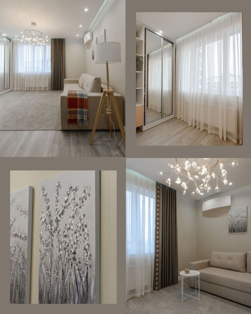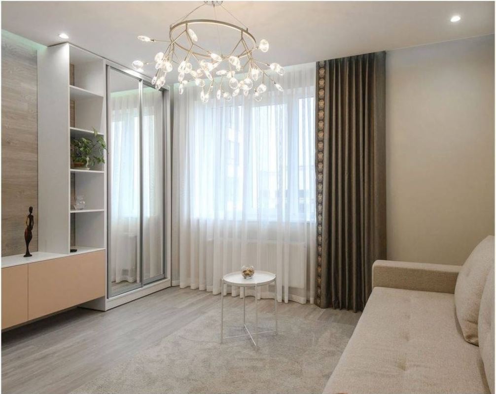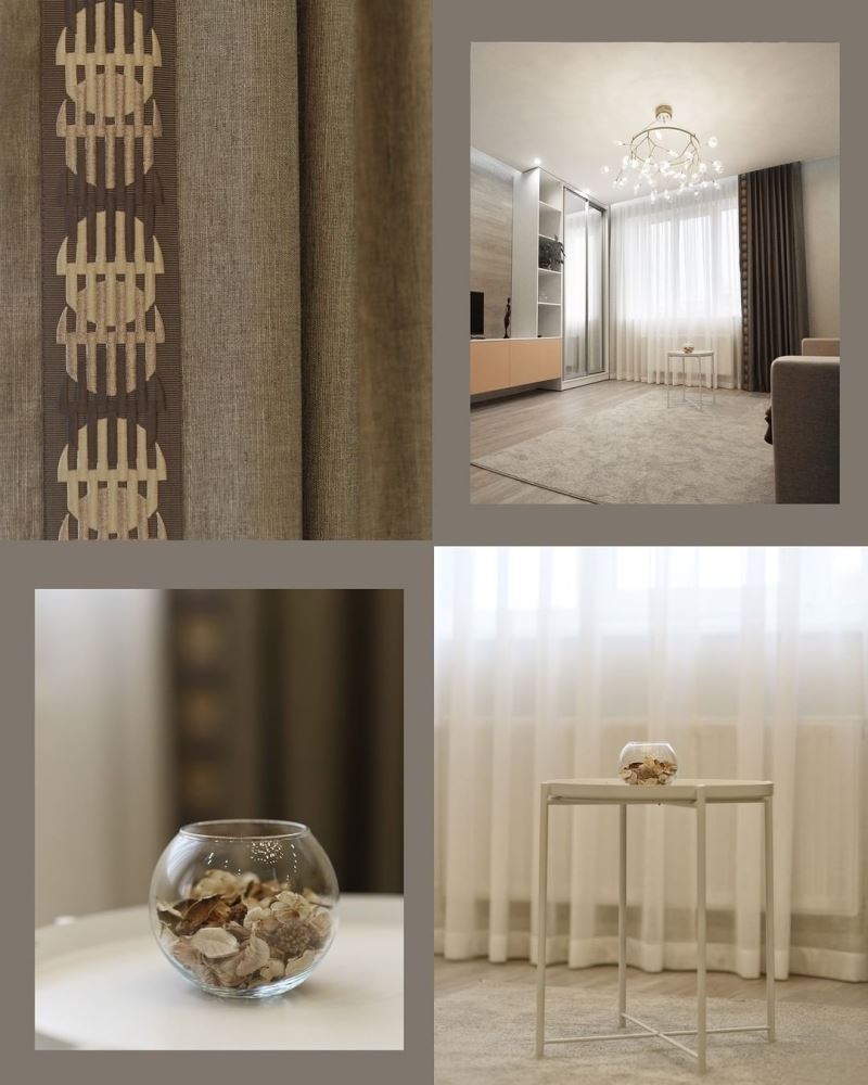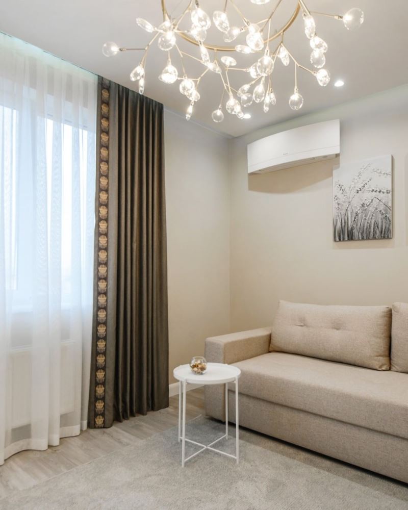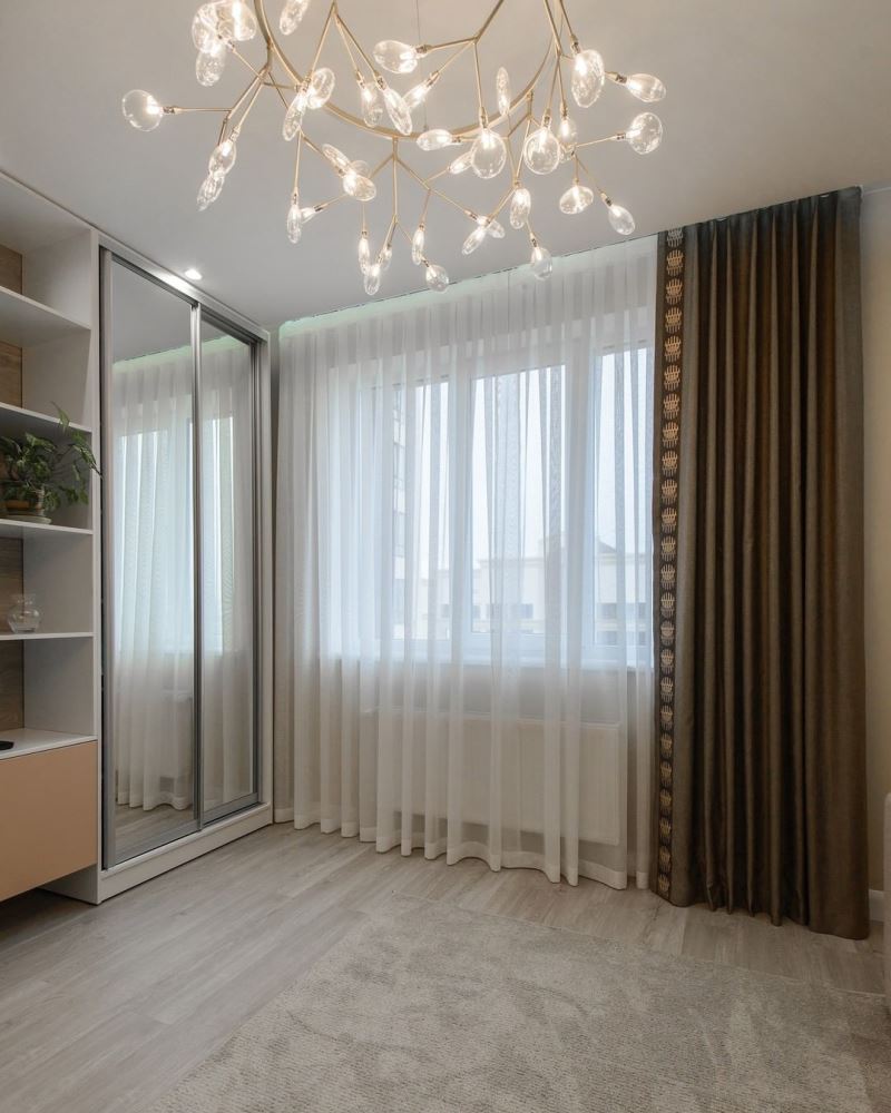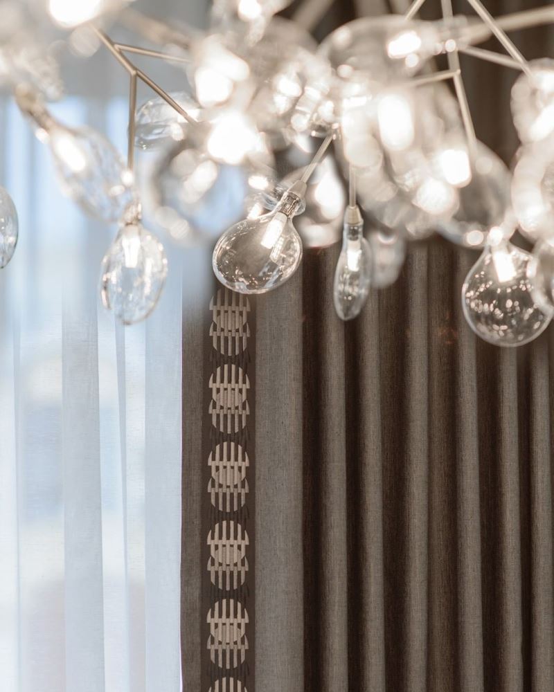 Для гостиной проекта «Утренний капучино» мы остановились на декоративных шторах. Они не будут двигаться и закрываться. Их задача – создать тональный акцент в дизайне комнаты, а также внести немного динамики в интерьер. Для этого мы подобрали ткань цвета черного шоколада и добавили ритмичный кант, который гармонирует с округлыми лепестками люстры.
