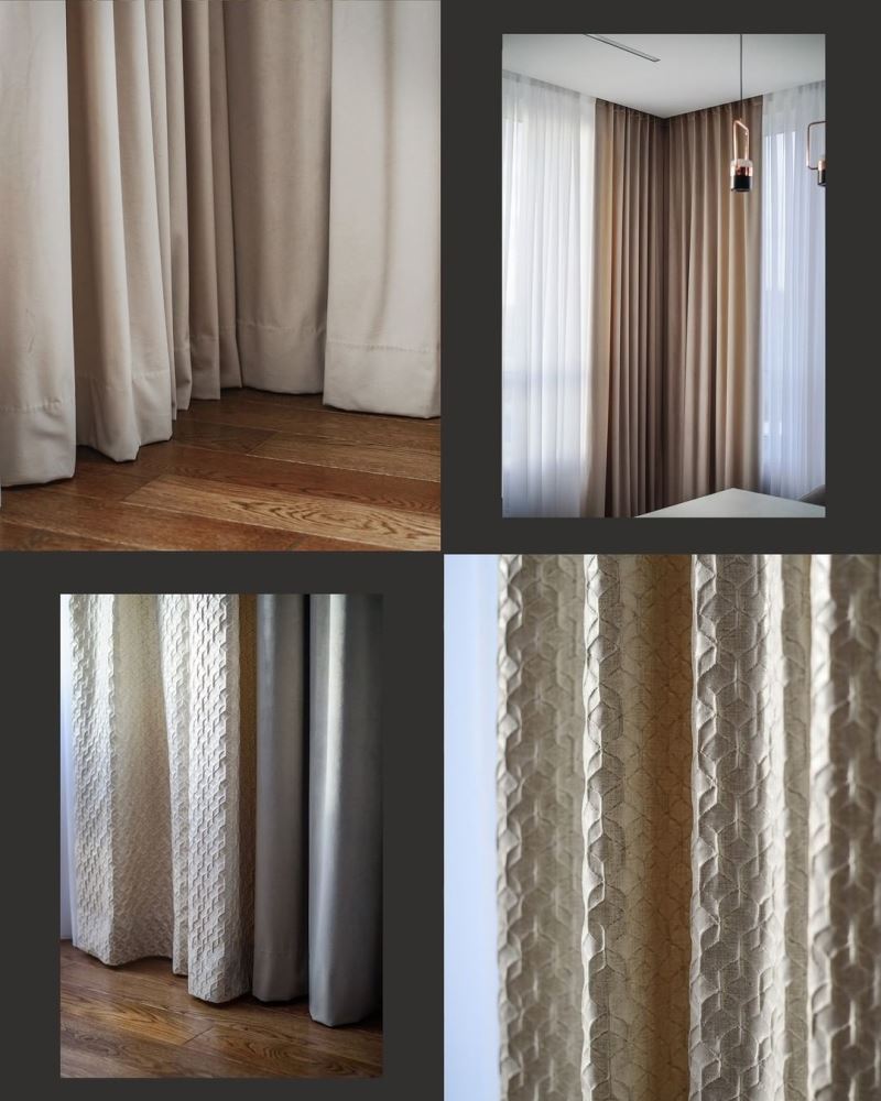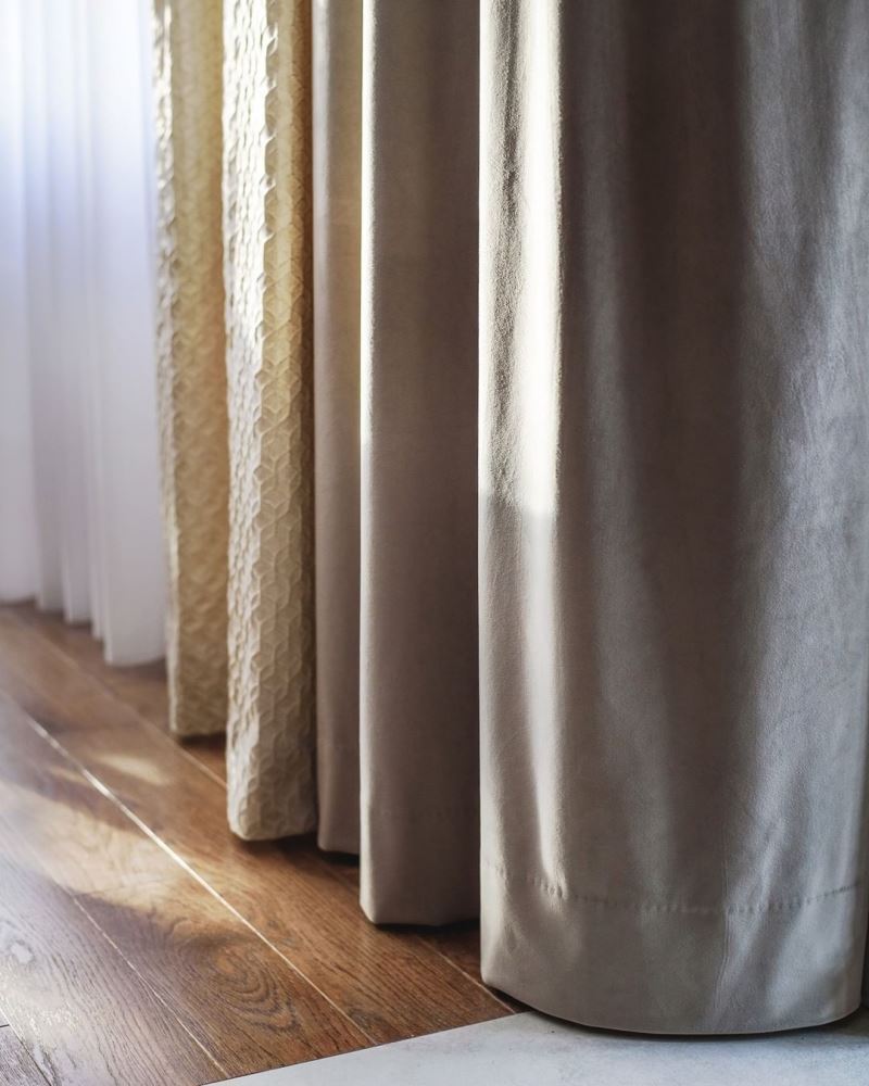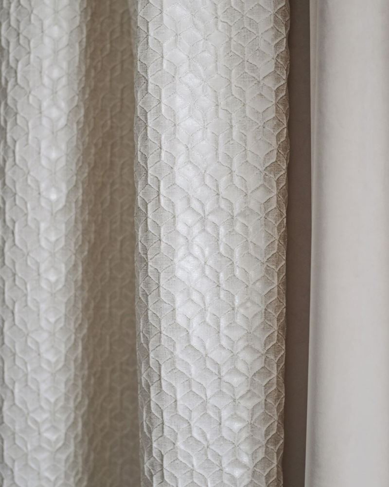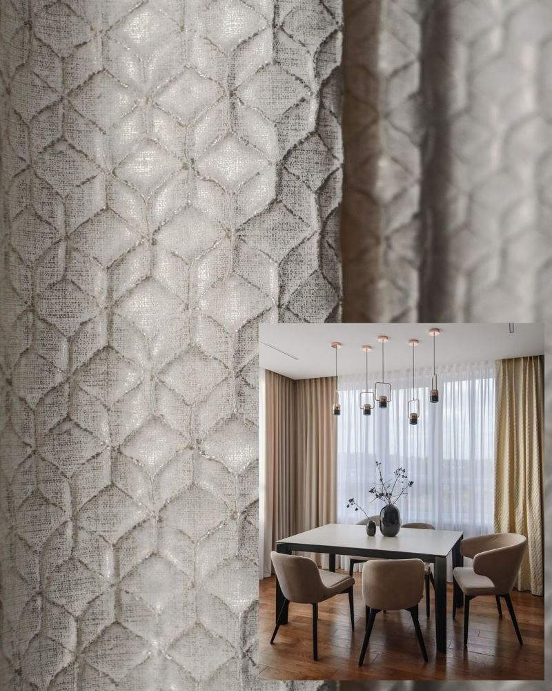 Мягкий бархат двух близких оттенков нежно укутывает уютным теплом. Глянцевый жаккард с мелким геометрическим орнаментом добавляет яркие привлекательные нотки. Гладкий шелковый тюль нежно струится, как белое перышко в воздухе. Шторы получились сдержанными спокойными, но в то же время современными и модными.