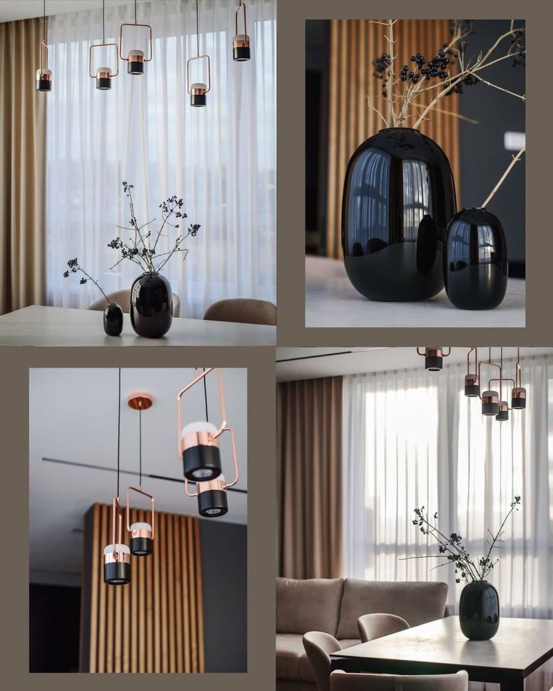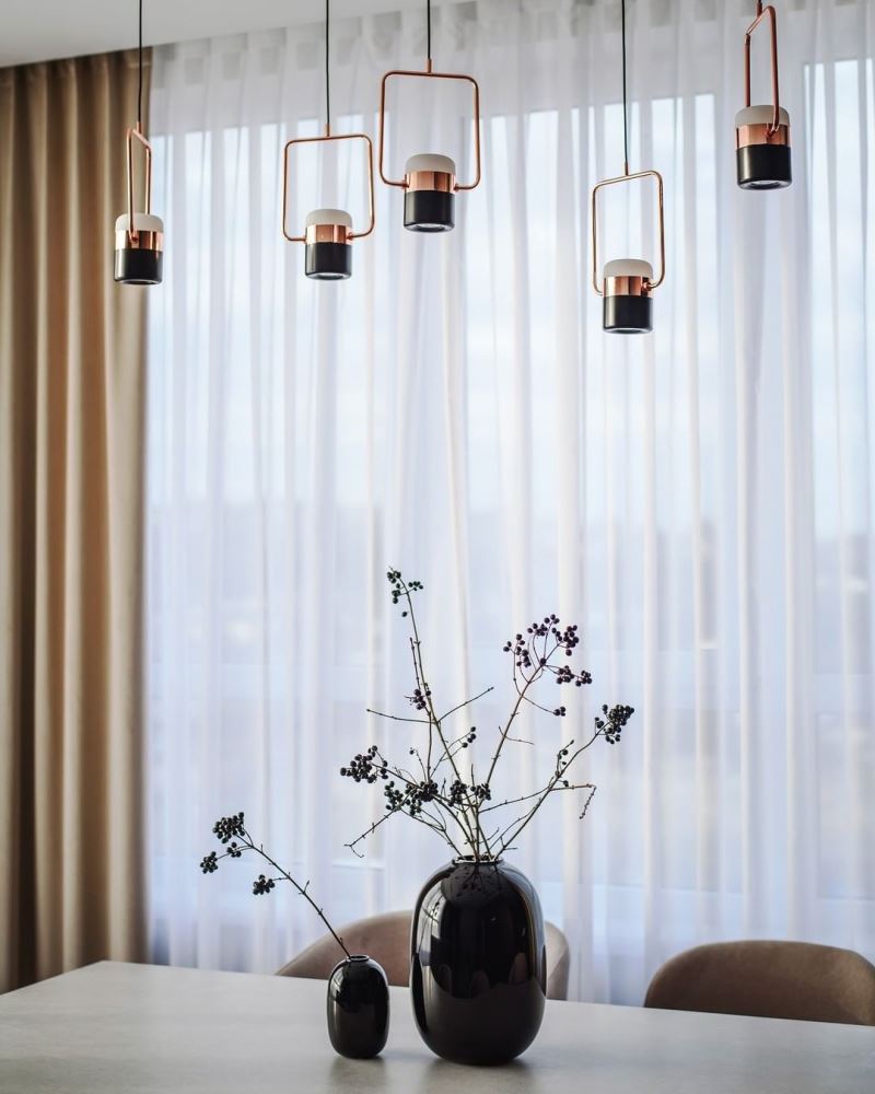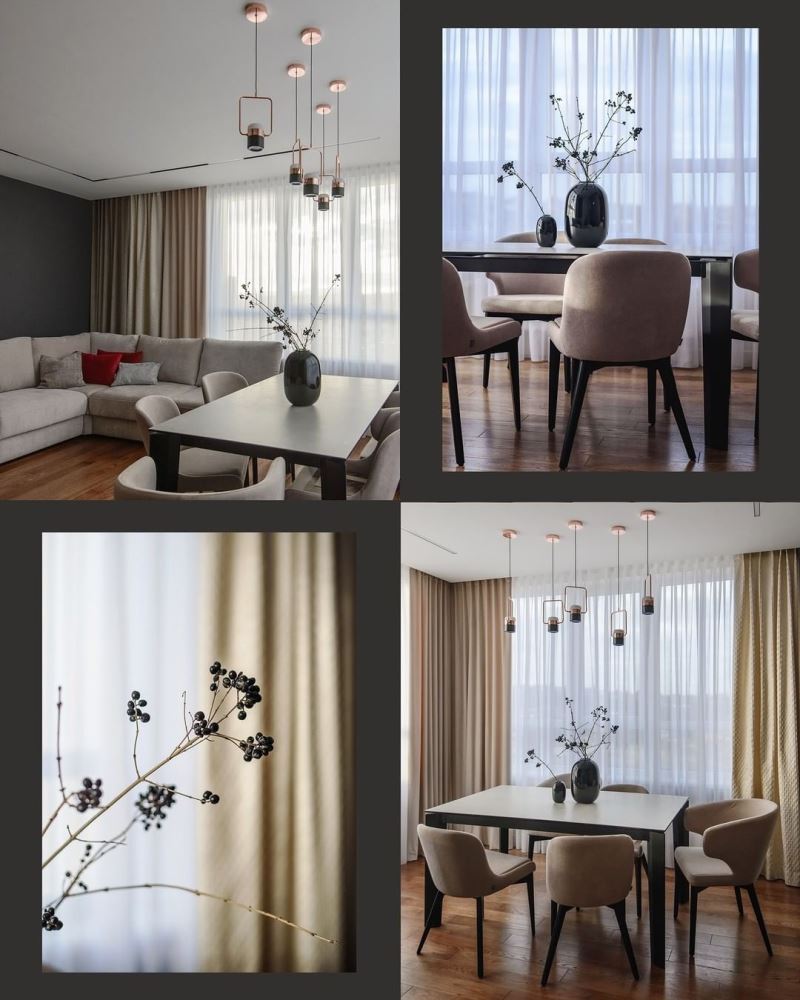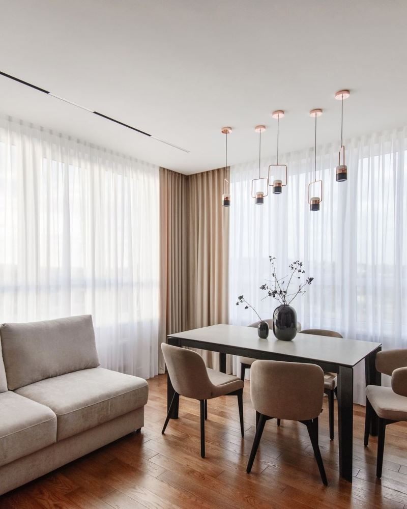 Мягкий бархат двух близких оттенков нежно укутывает уютным теплом. Глянцевый жаккард с мелким геометрическим орнаментом добавляет яркие привлекательные нотки. Гладкий шелковый тюль нежно струится, как белое перышко в воздухе. Шторы получились сдержанными спокойными, но в то же время современными и модными.