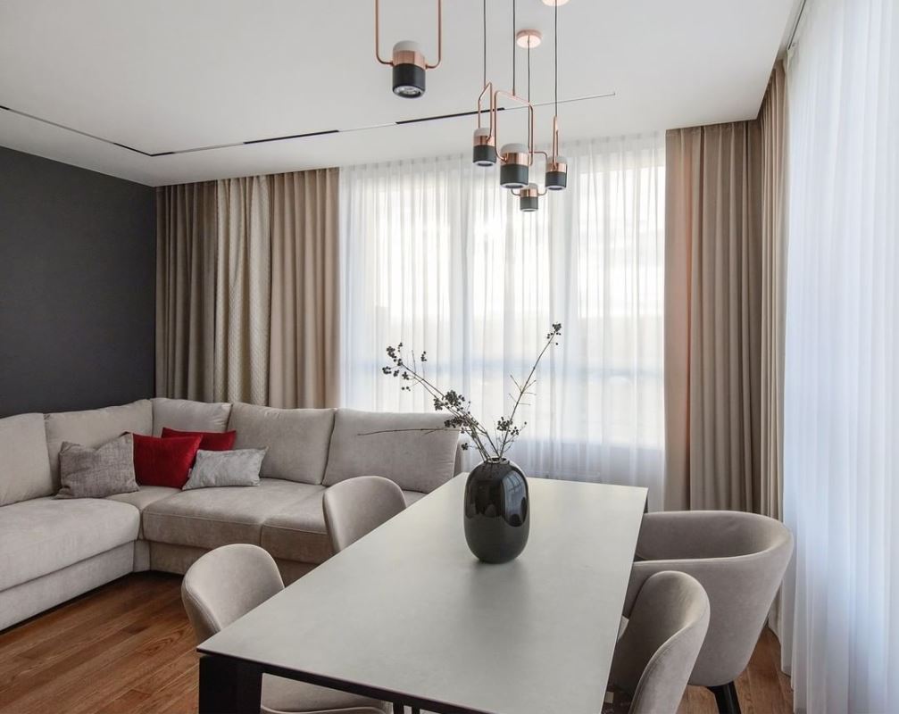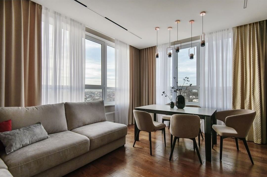 Панорамные окна мы обыграли композицией из нескольких видов ткани. Такой прием отлично подходит для большого окна, особенно, когда их — два в одной комнате.