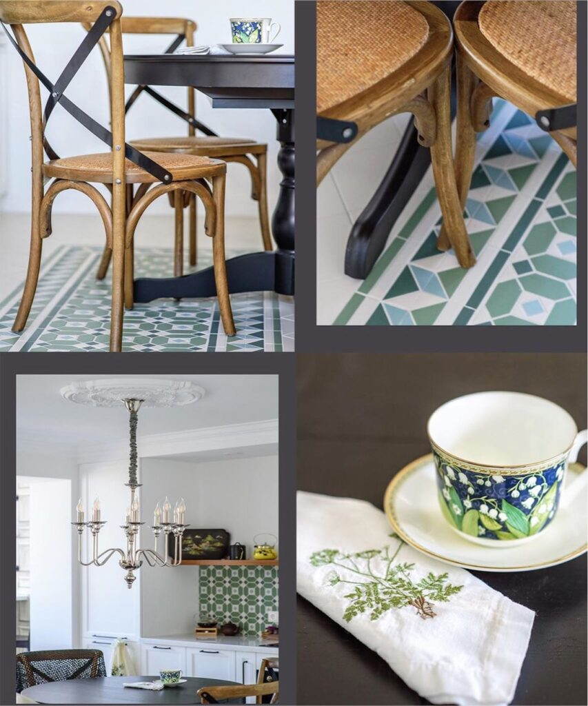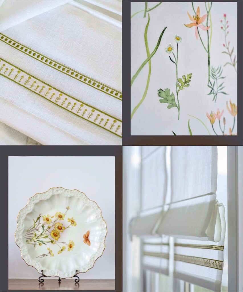 Нежный акварельный принт как бы перетекает с обоев в спальне на декоративную ленту римских штор в столовой и антикварные тарелки.