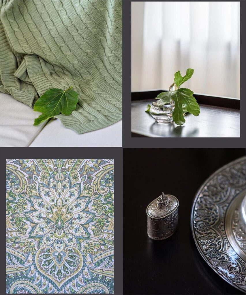 Мягкий и сложный оттенок зеленого изменяется на разных поверхностях от нежно-травянистого до глубокого изумрудного, но все-таки создает особенное настроение во всей квартире.