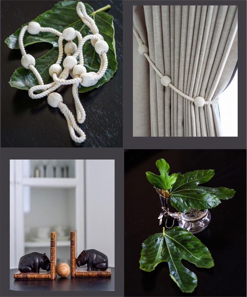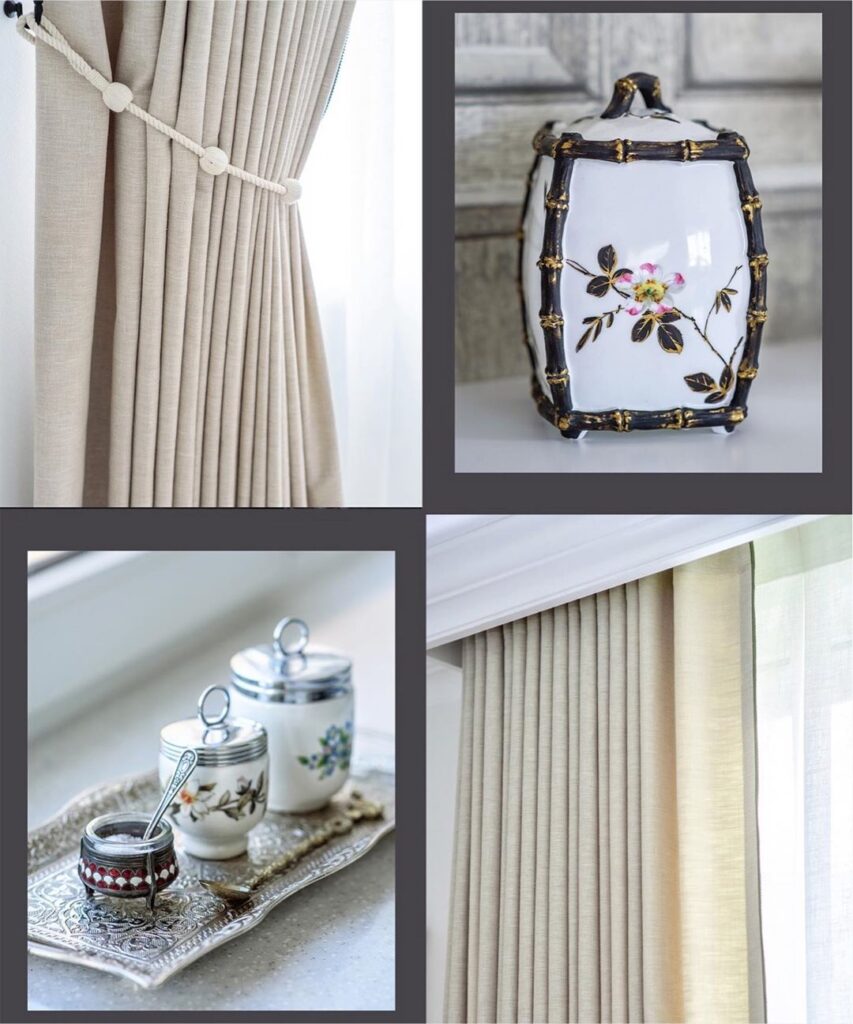 Тонкий графичный кант с мелкими зубчиками по боковому шву портьеры в сочетании с крупными хлопковыми бусинами на подхвате созвучны формам и линиям роскошной фарфоровой банки.