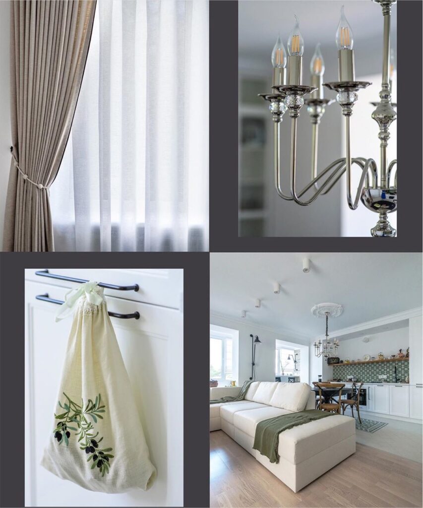 Люстра над обеденным столом продолжает ритм четких складок на шторе, а бархатный “чулочек” на цепочке создает такой деликатный, но такой необходимый контраст с хлопковой фактурой портьер.