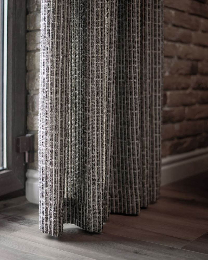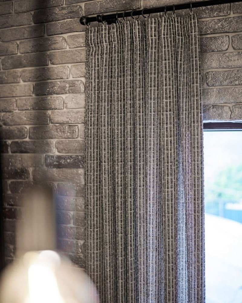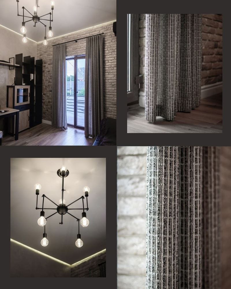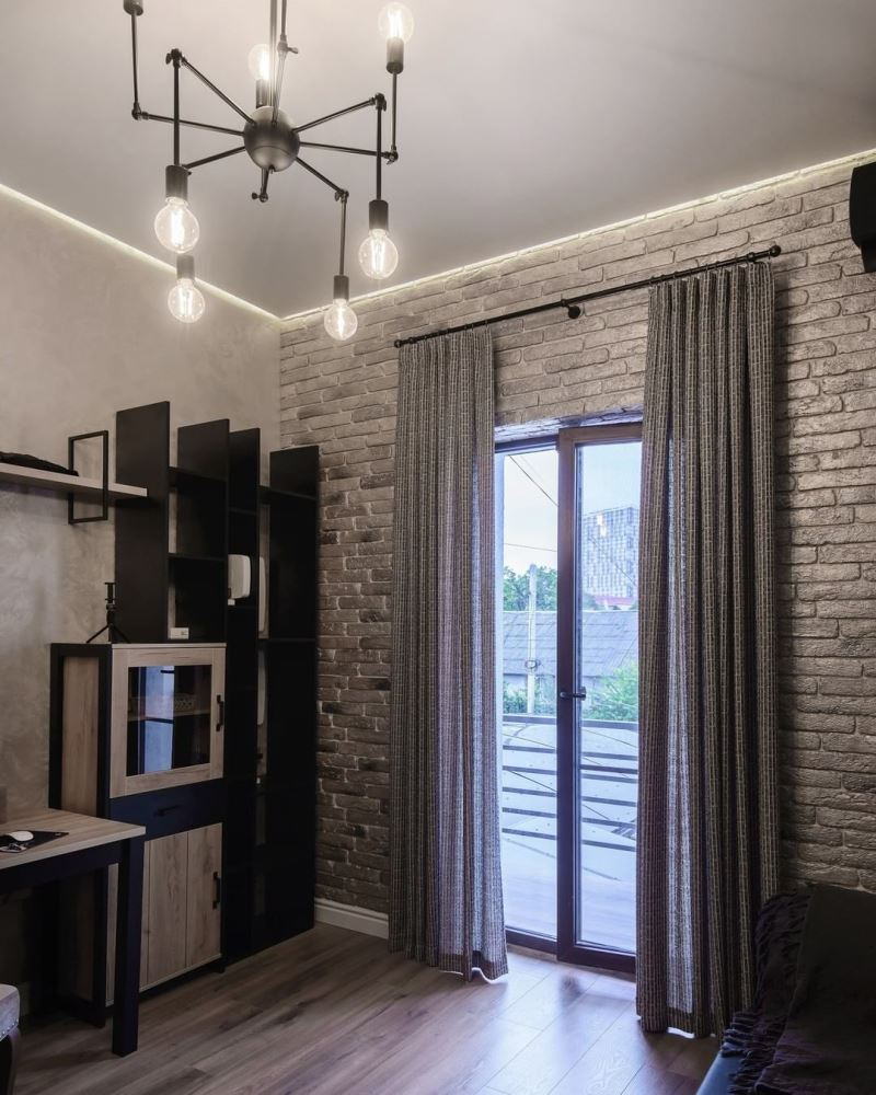 Чёрный карниз подчеркнул графичность комнаты, отлично сочетаясь со светильником, темной мебелью и кирпичной декоративной стеной.