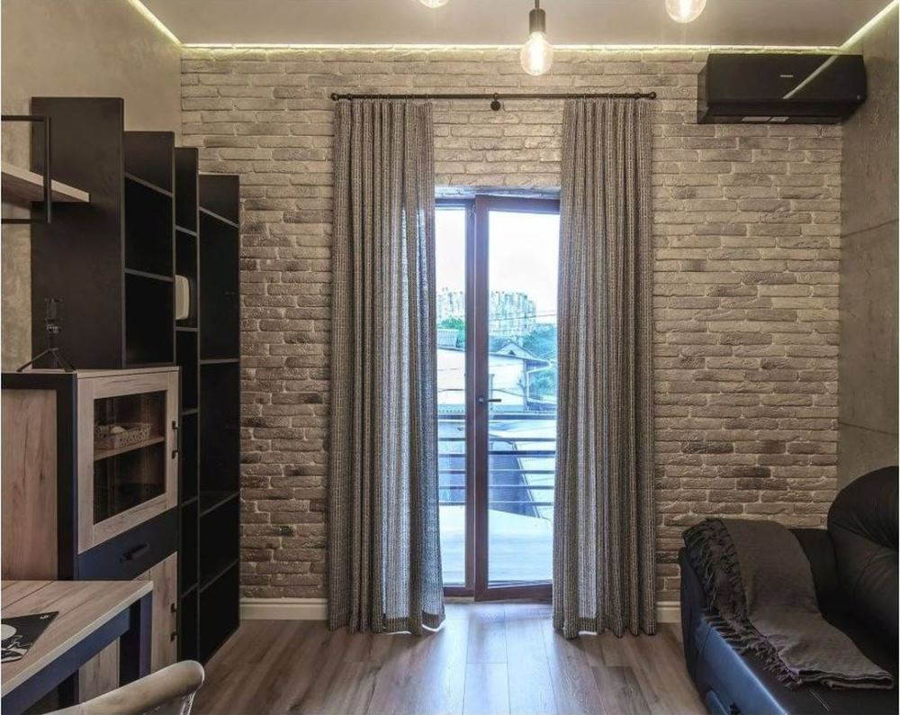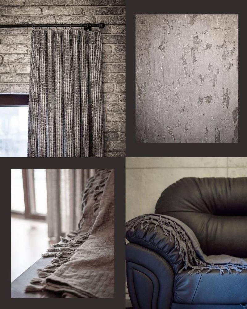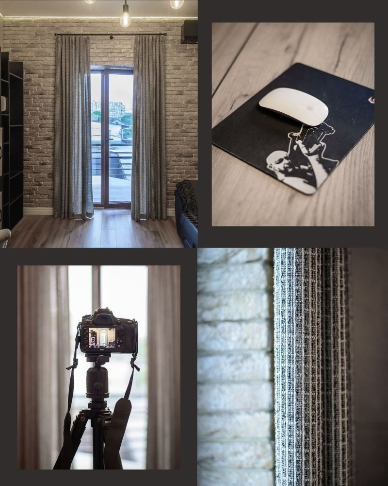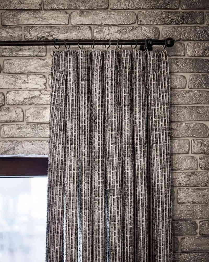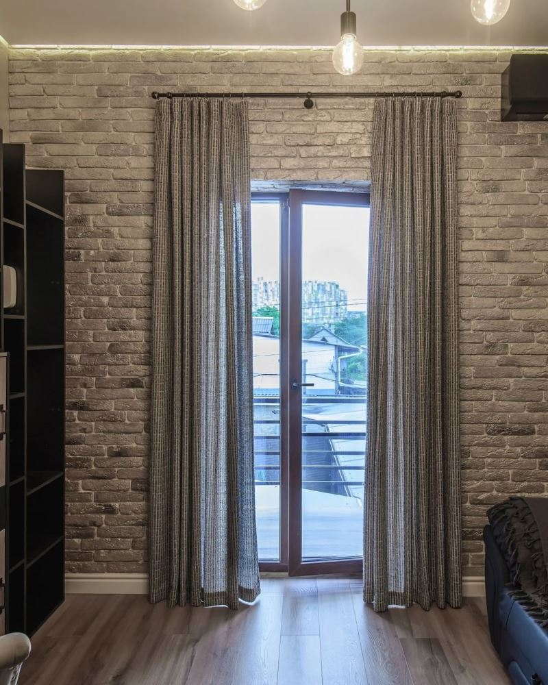Чёрный карниз подчеркнул графичность комнаты, отлично сочетаясь со светильником, темной мебелью и кирпичной декоративной стеной.