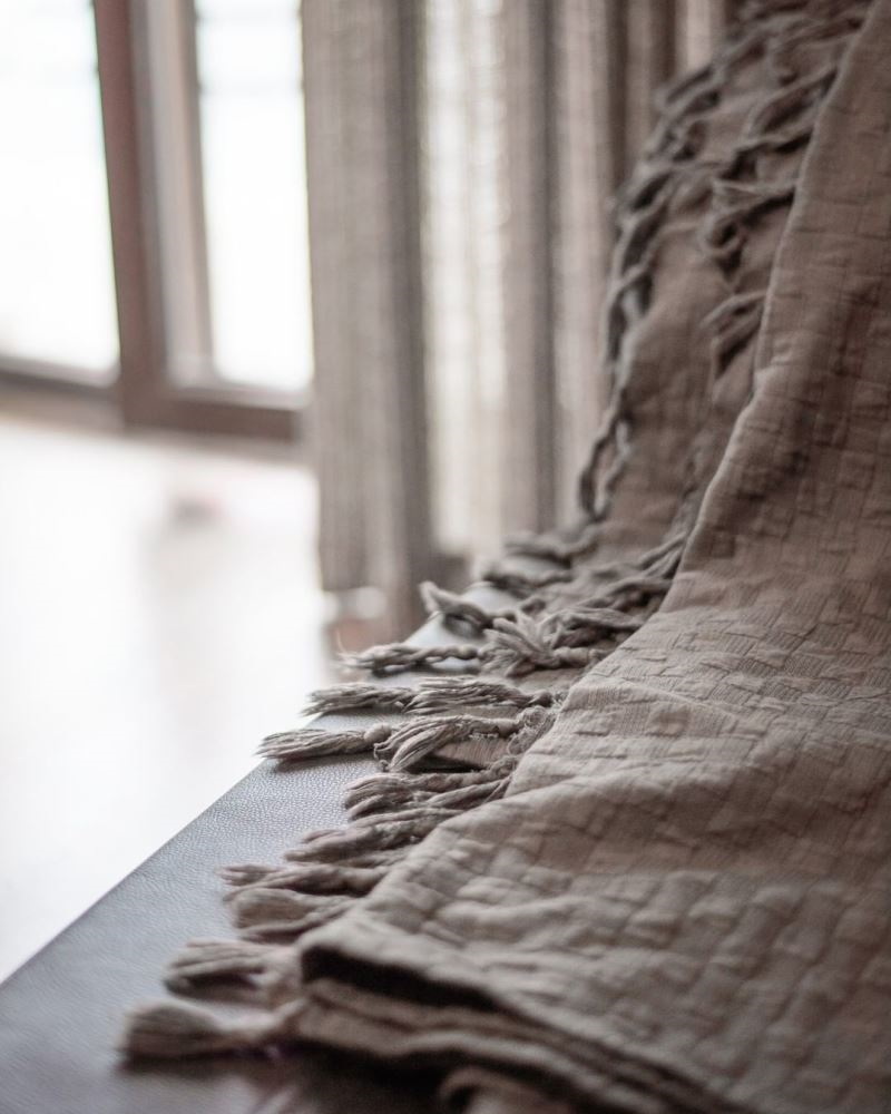 На французском окне — тяжелая меланжевая ткань с крупной фактурой. Такой вариант не создает препятствий для попадания дневного света, но при необходимости позволяет спрятаться от ярких солнечных лучей.