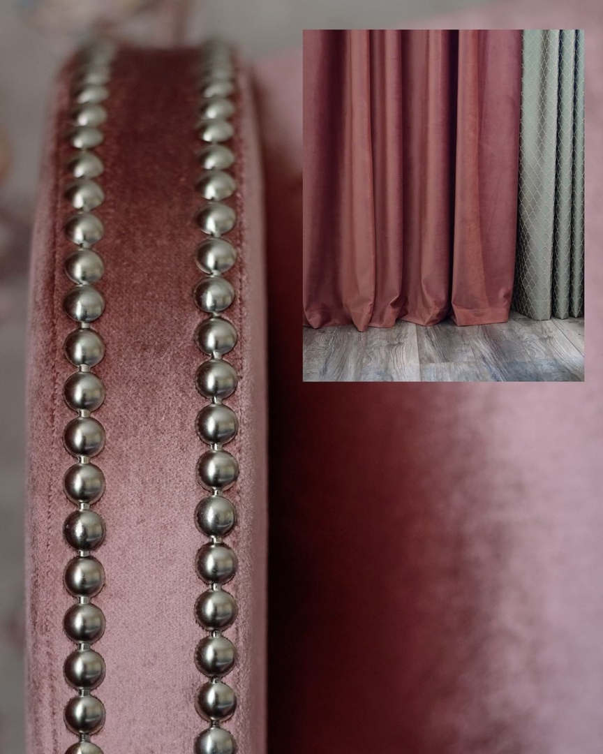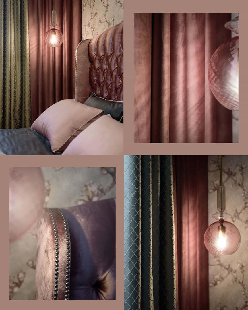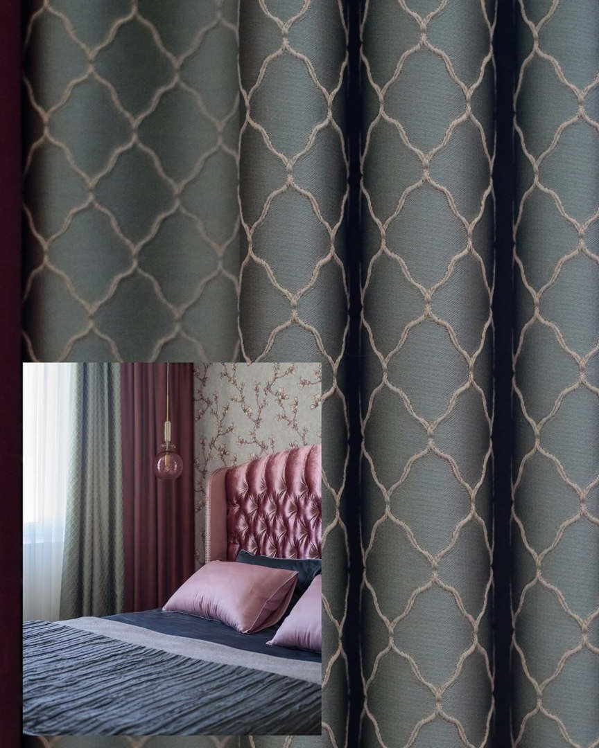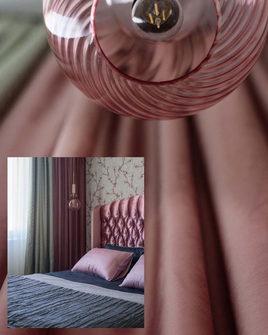 К роскошному бархатному изголовью сложного глубокого цвета мы подобрали комбинированные шторы. По бокам мягкий темно розовый бархат, а в центре контрастный изумрудный жаккард.