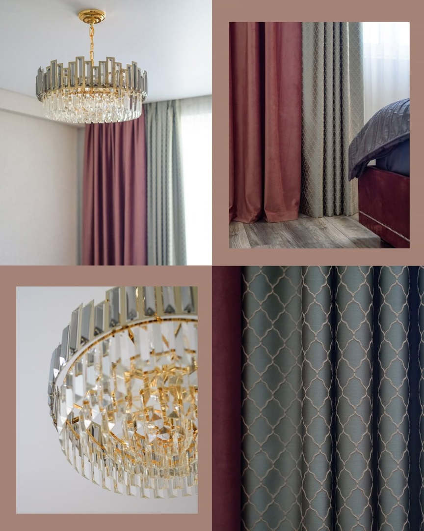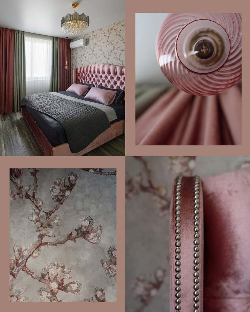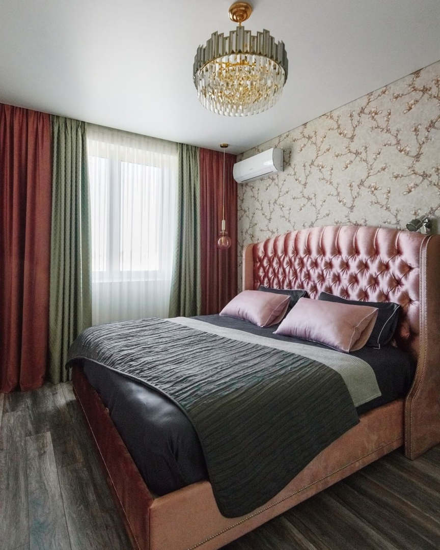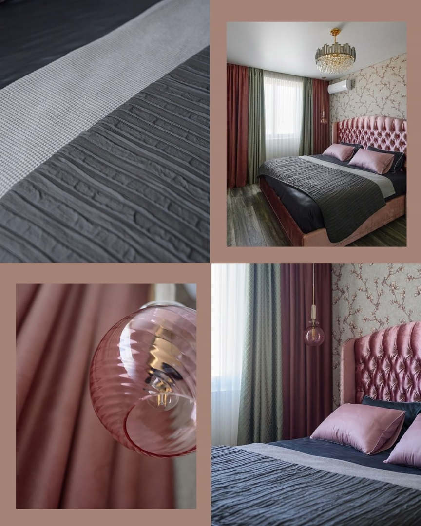 К роскошному бархатному изголовью сложного глубокого цвета мы подобрали комбинированные шторы. По бокам мягкий темно розовый бархат, а в центре контрастный изумрудный жаккард.