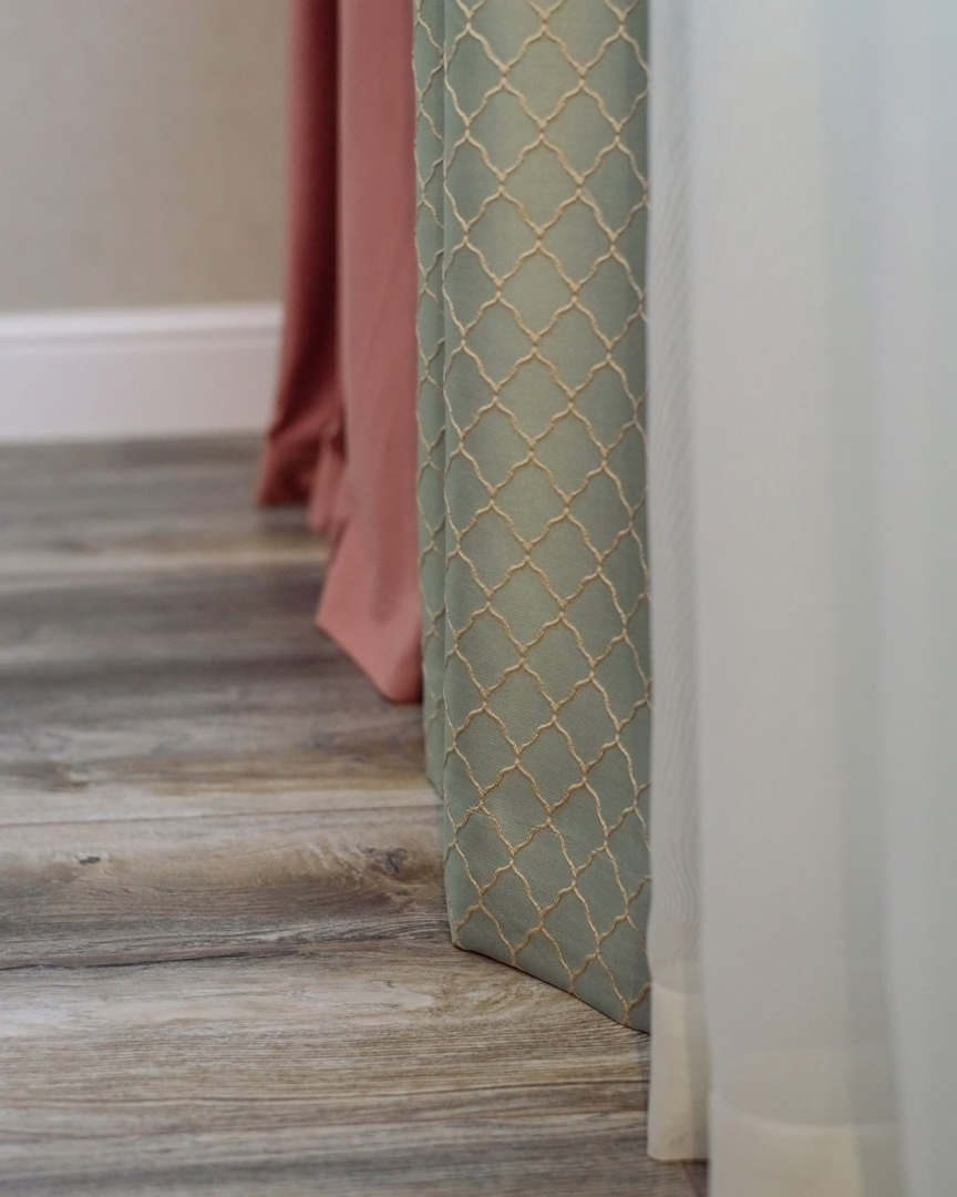 Шторы дублированы подкладкой из блекаута, что помогает улучшить сон и сохранить оригинальный цвет ткани. А главное, оба супруга согласились, что именно такое решение нужно в их спальне.