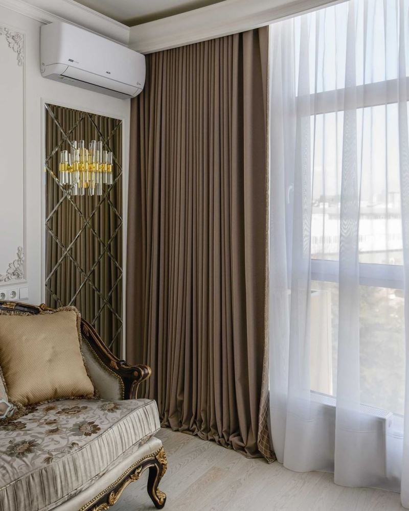 Для больших радиусных окон мы использовали специальный алюминиевый профиль, который устанавливается точно по нужной форме. И, главное, обеспечивает легкое и плавное движение штор по карнизу. - декоративность, оправданная технологией пошива. Посмотрите, как мы обработали боковой шов портьеры с помощью деликатной тесьмы-реснички.