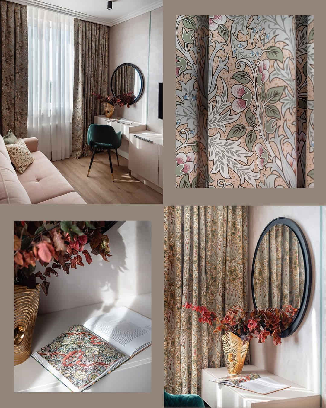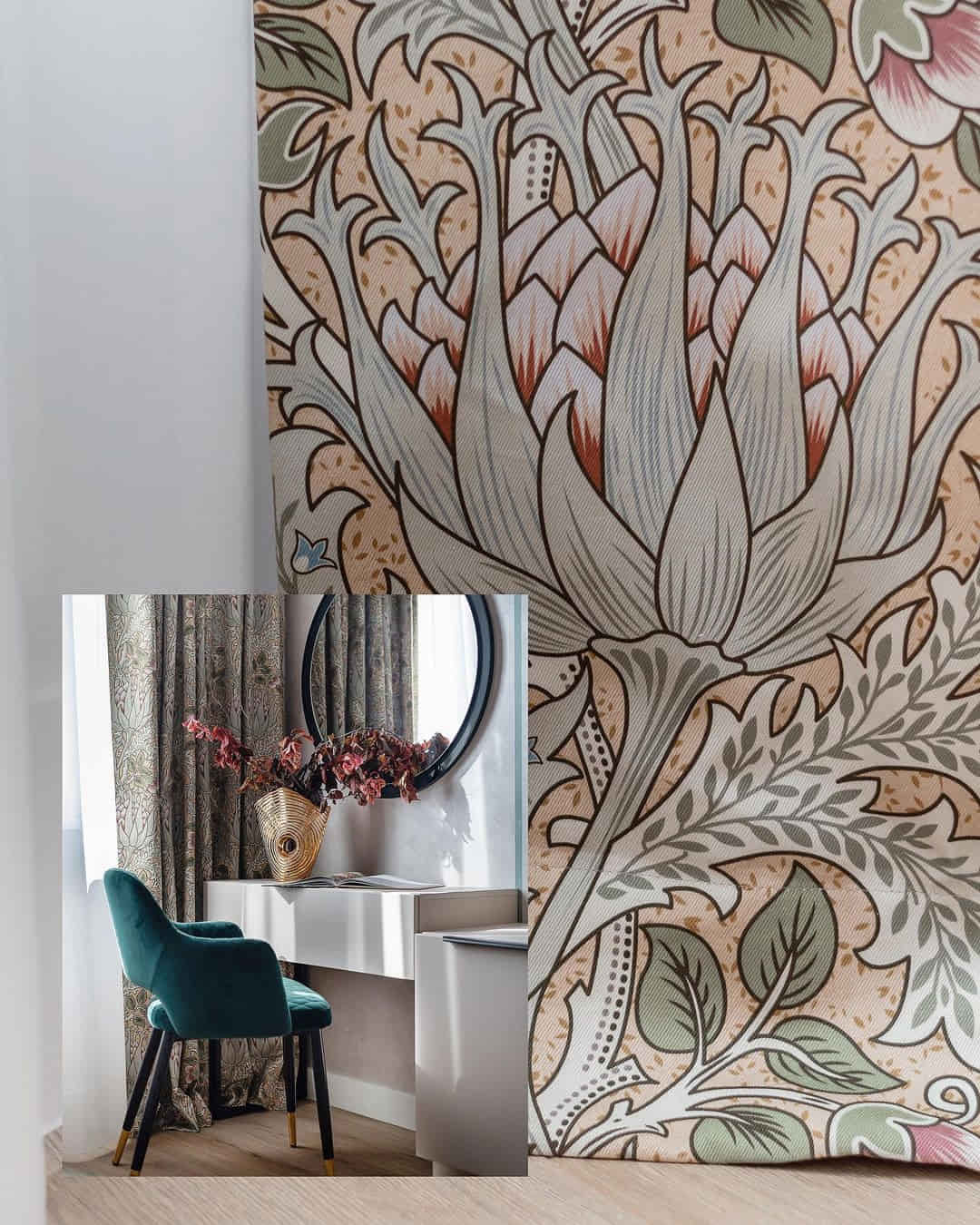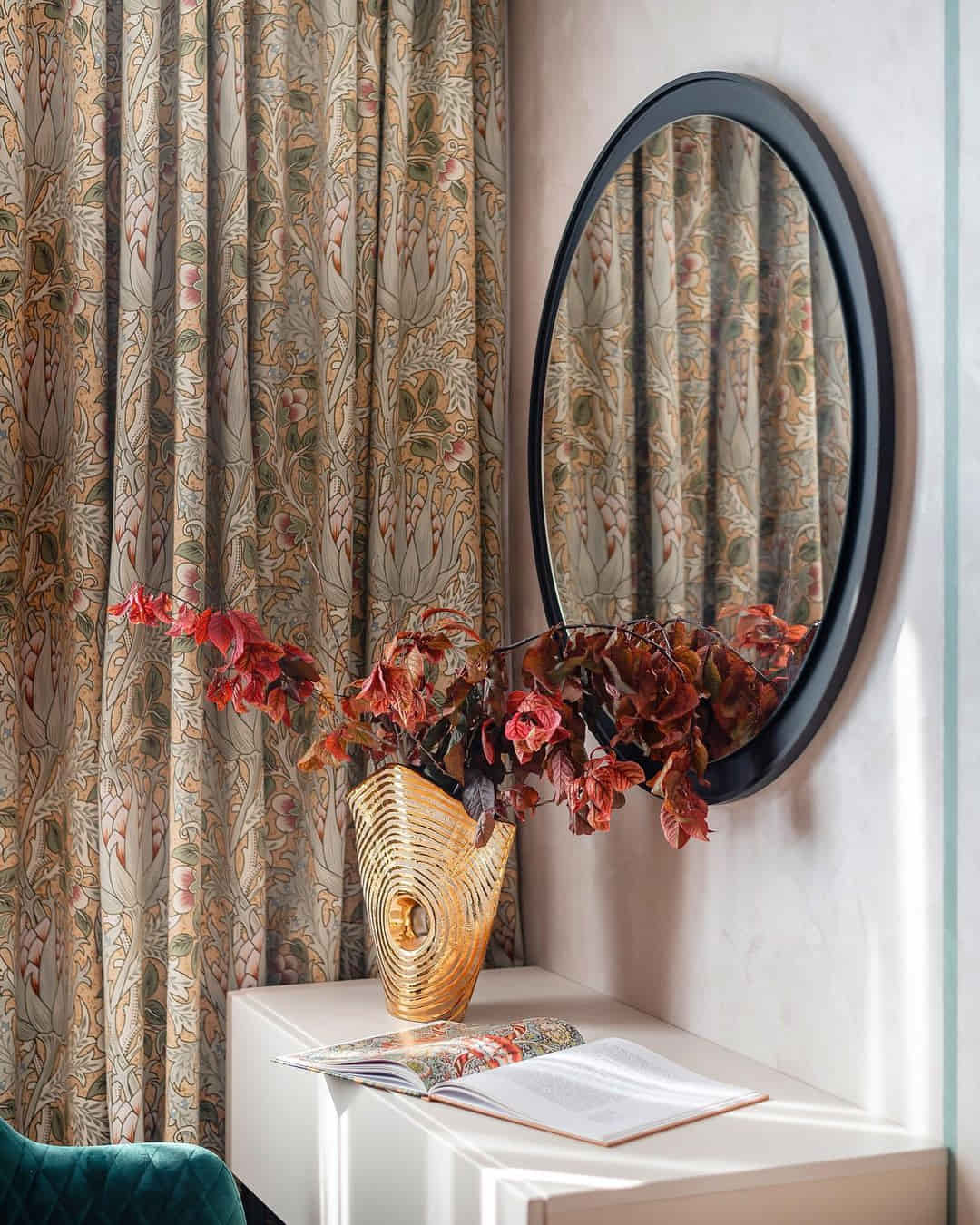 Шторы с крупными выразительными артишоками, золотистая подкладка и гобеленовые подушки с мелкими цветочками. Сложная колористика, натуральные волокна в составе тканей и сочетание роскошного бархата с уютным хлопком — всё это вместе создаёт пространство, которые выглядит традиционным и, одновременно, абсолютно актуальным.