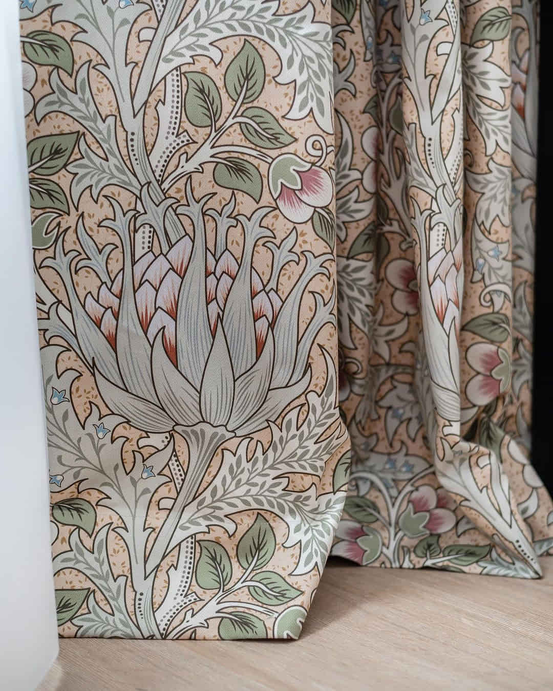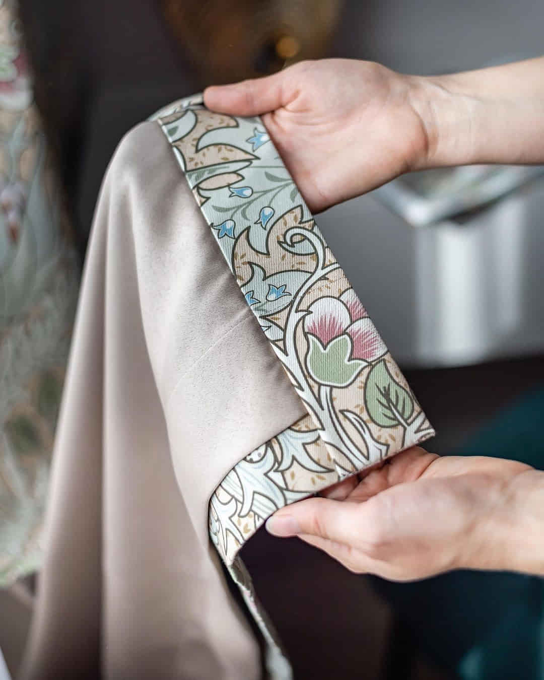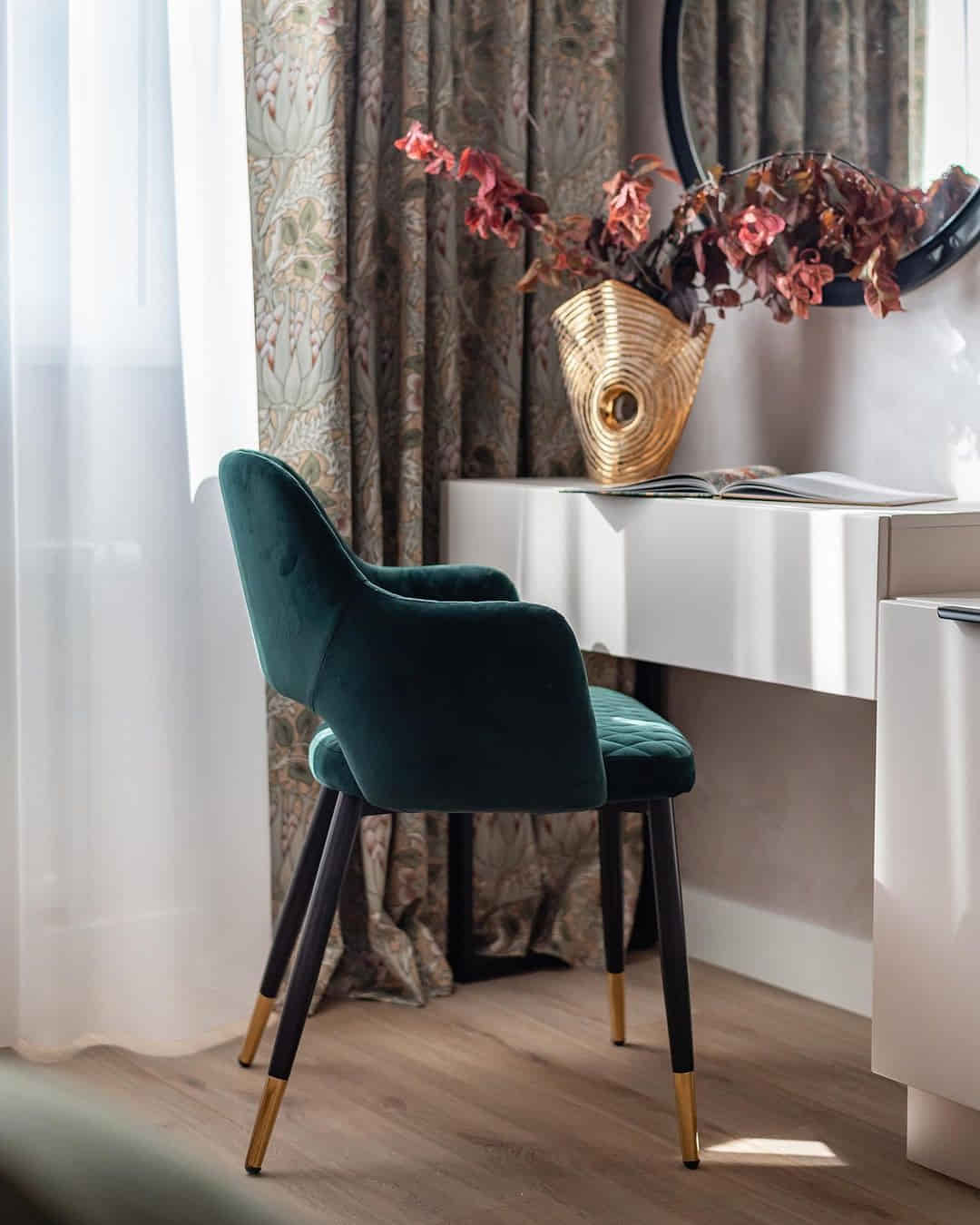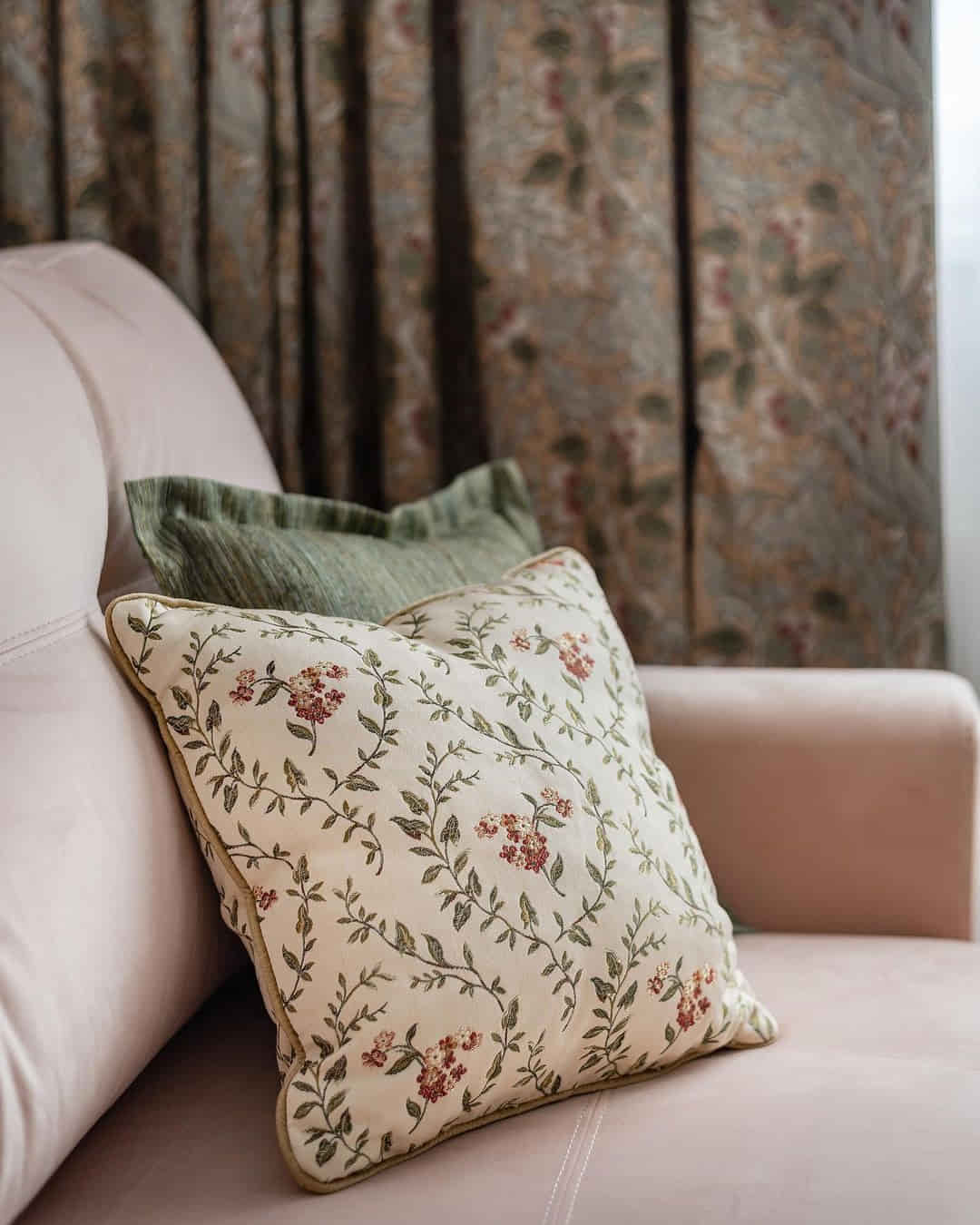 Шторы с крупными выразительными артишоками, золотистая подкладка и гобеленовые подушки с мелкими цветочками. Сложная колористика, натуральные волокна в составе тканей и сочетание роскошного бархата с уютным хлопком — всё это вместе создаёт пространство, которые выглядит традиционным и, одновременно, абсолютно актуальным.