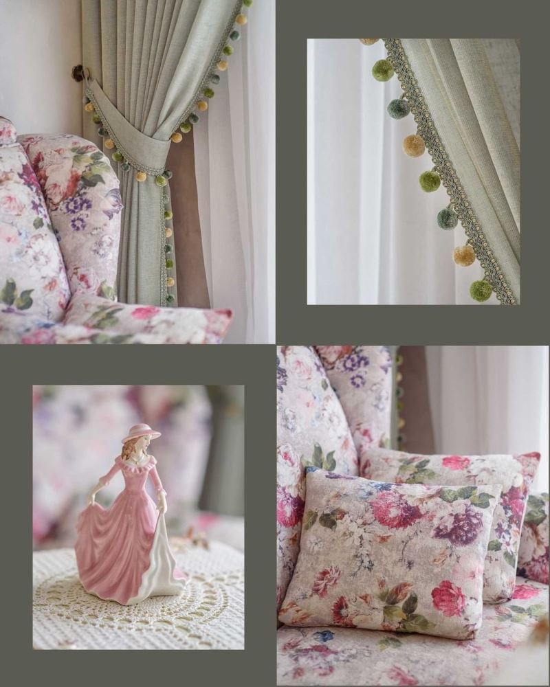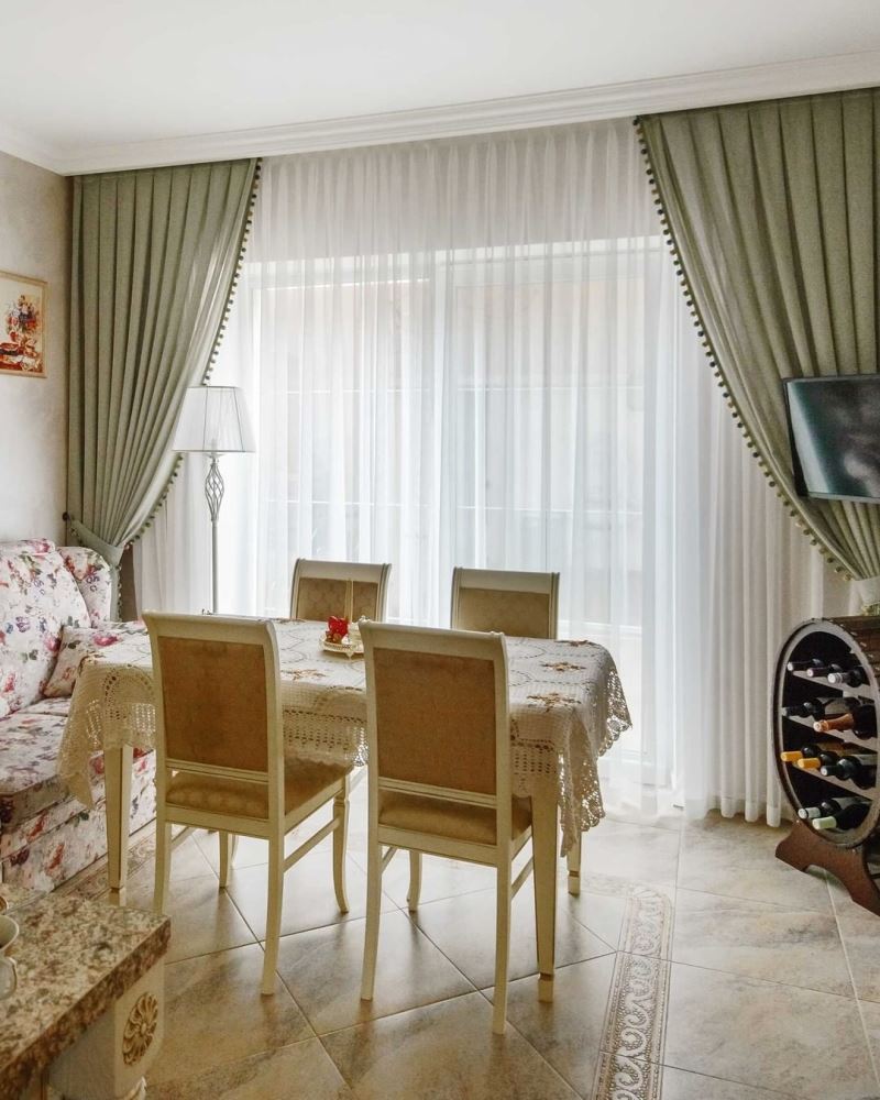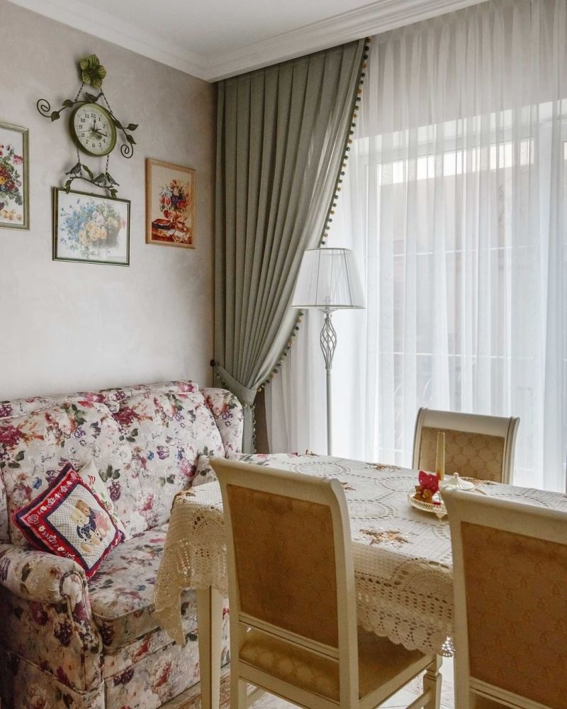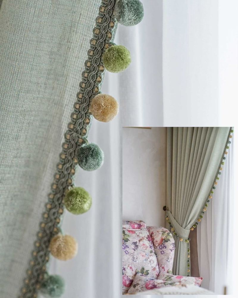 Выбирая шторы для кухни в проекте «Эхо прованса» мы подобрали ткань сложного бирюзово-зеленого оттенка, имитирующую фактуру льна. Украсили бахромой с пушистыми шариками. Шторы получились легкими, романтичными и хорошо гармонируют с умиротворяющим видом сада из окна.