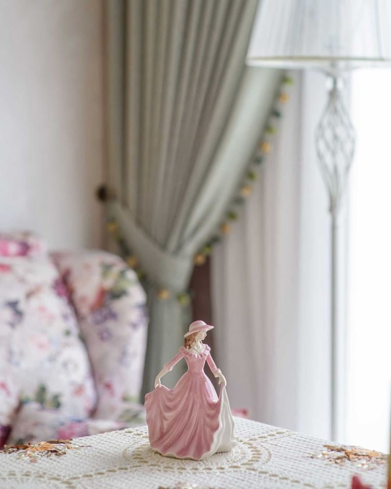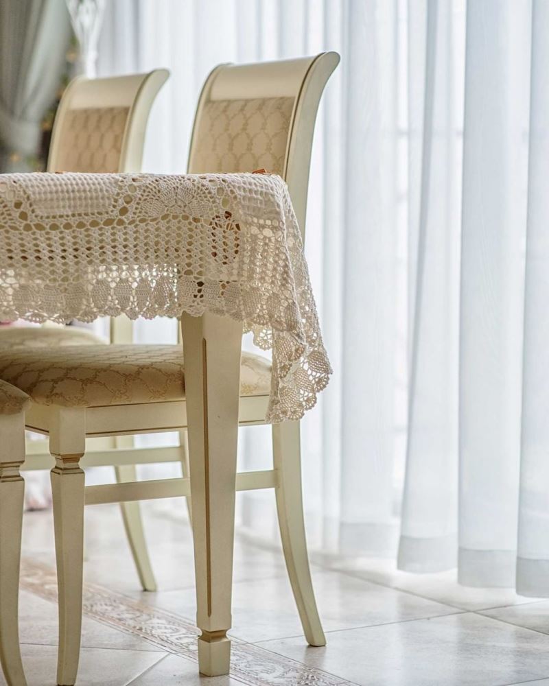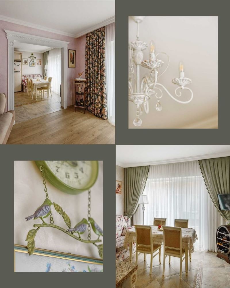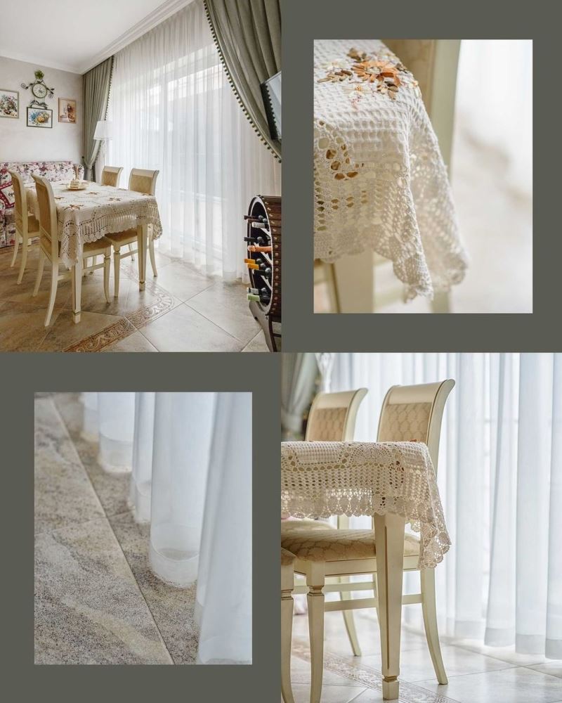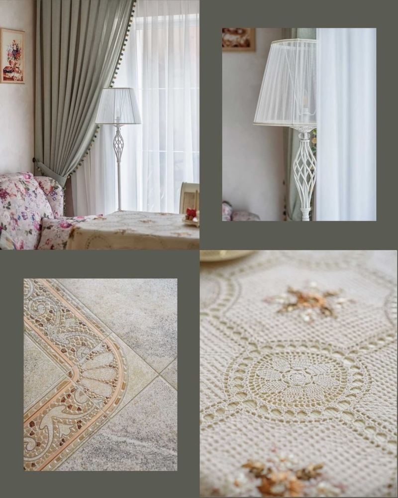 Выбирая шторы для кухни в проекте «Эхо прованса» мы подобрали ткань сложного бирюзово-зеленого оттенка, имитирующую фактуру льна. Украсили бахромой с пушистыми шариками. Шторы получились легкими, романтичными и хорошо гармонируют с умиротворяющим видом сада из окна.