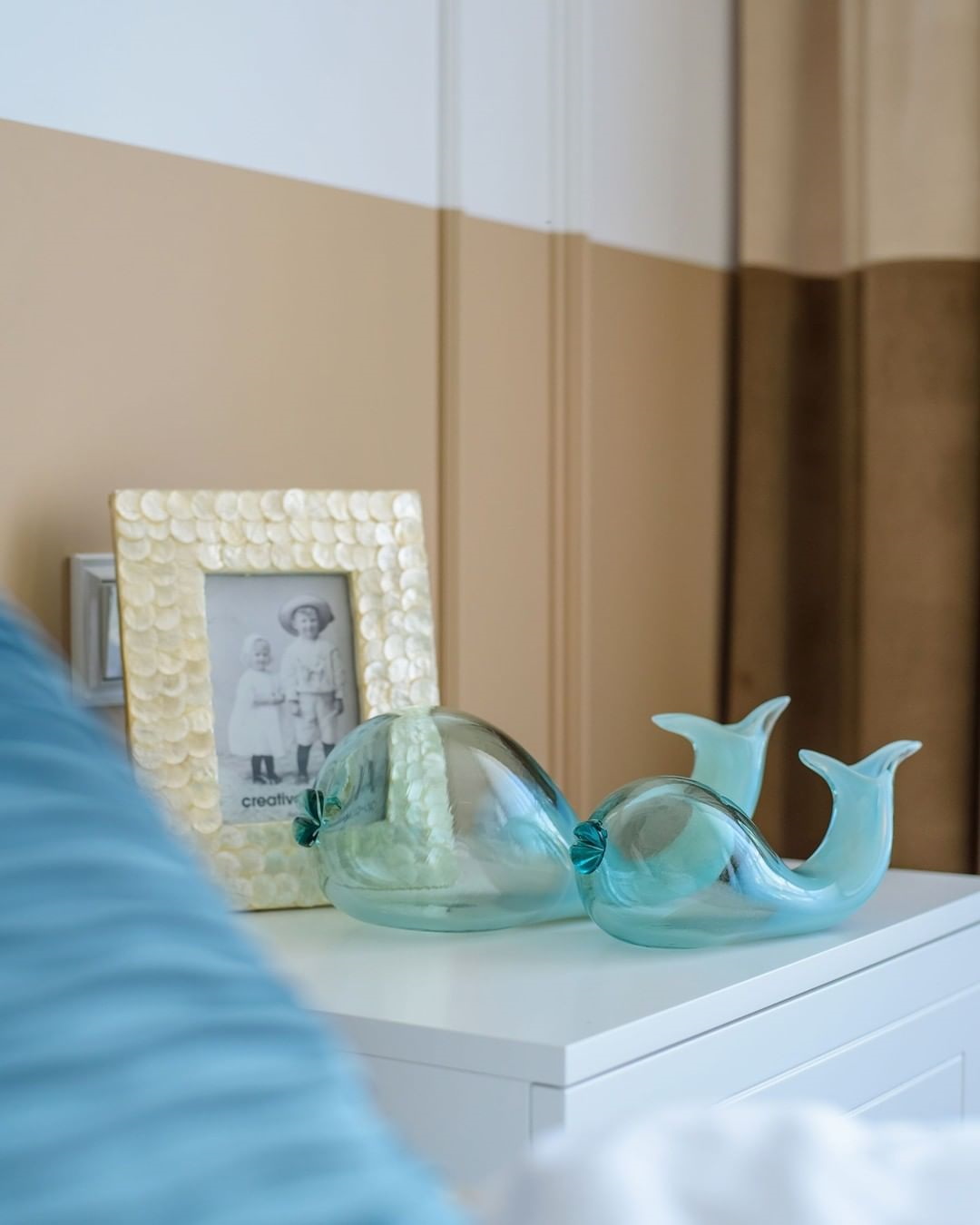 Обратите внимание на декор. Милые прозрачные киты, фоторамки с ракушками. Разве не прелесть?