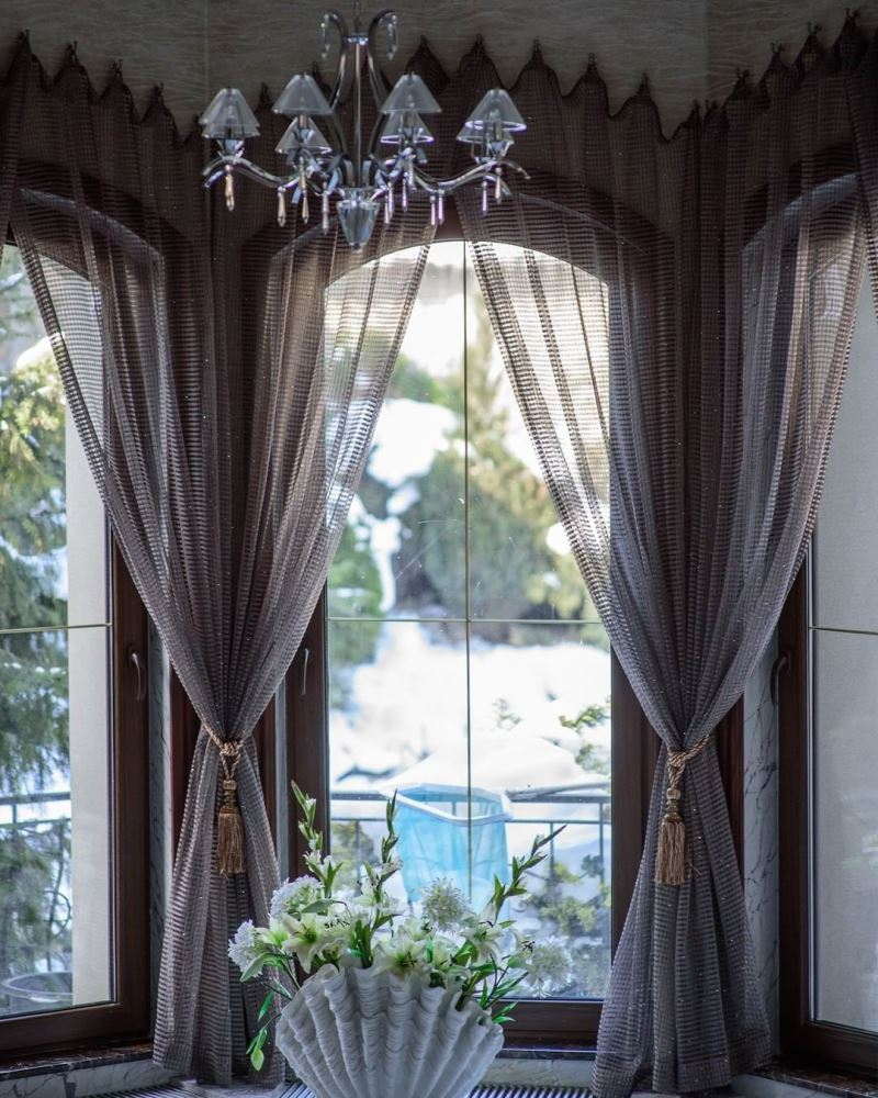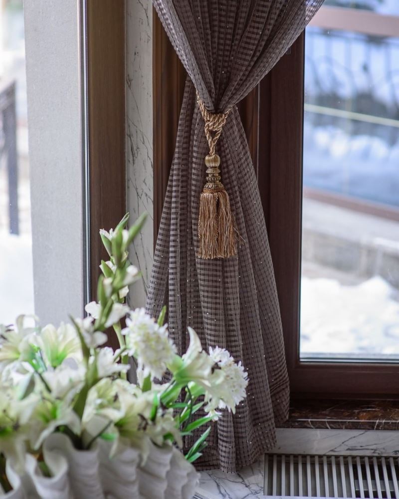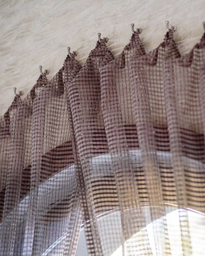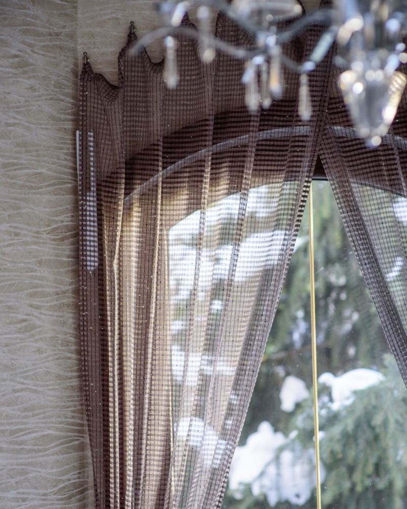 Вместо органзы с вышивкой мы взяли фактурную сетку сложного шоколадного оттенка. А заметили блестки-пайетки на шторе? Эти сияющие капельки добавили глянца под стать интерьеру дома. Роль зонирующего элемента выполняет легкий тюль бежевого оттенка. Он отделяет зону отдыха от спальни.