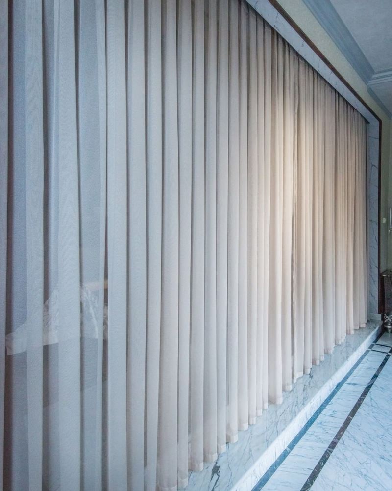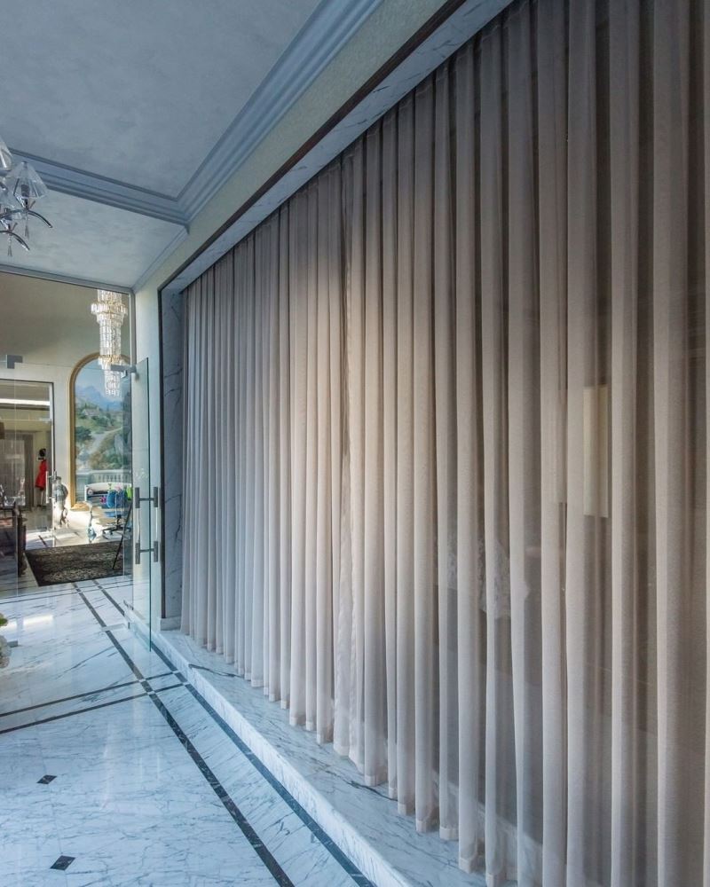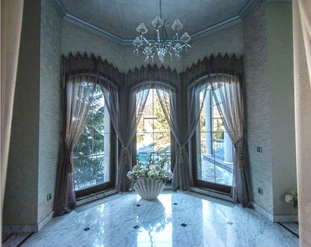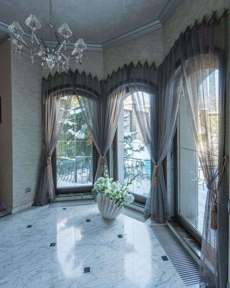 Вместо органзы с вышивкой мы взяли фактурную сетку сложного шоколадного оттенка. А заметили блестки-пайетки на шторе? Эти сияющие капельки добавили глянца под стать интерьеру дома. Роль зонирующего элемента выполняет легкий тюль бежевого оттенка. Он отделяет зону отдыха от спальни.