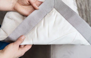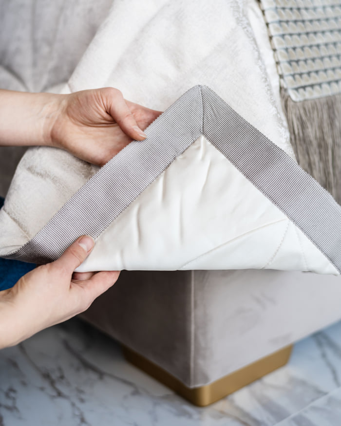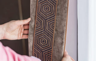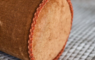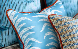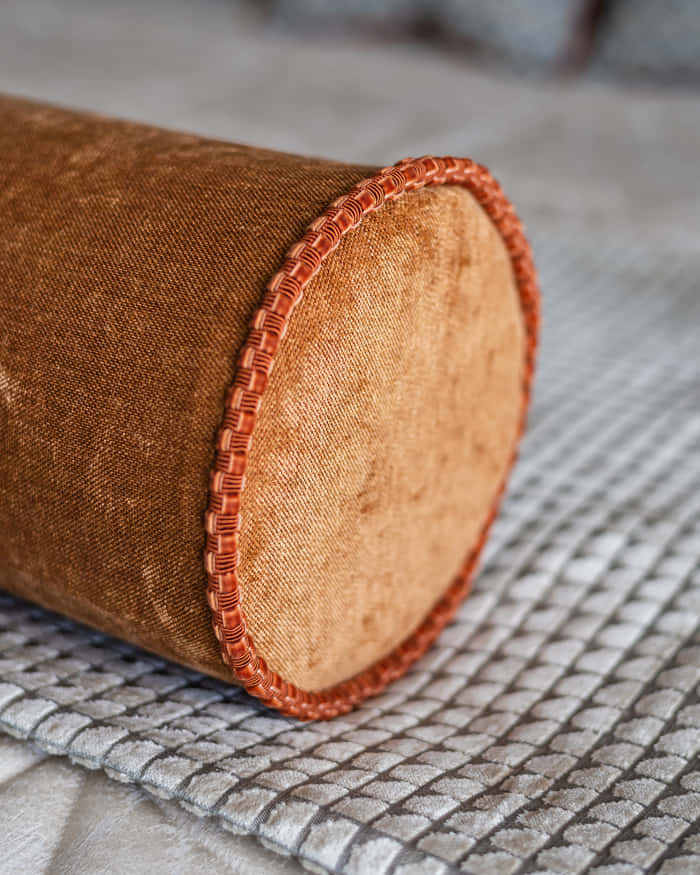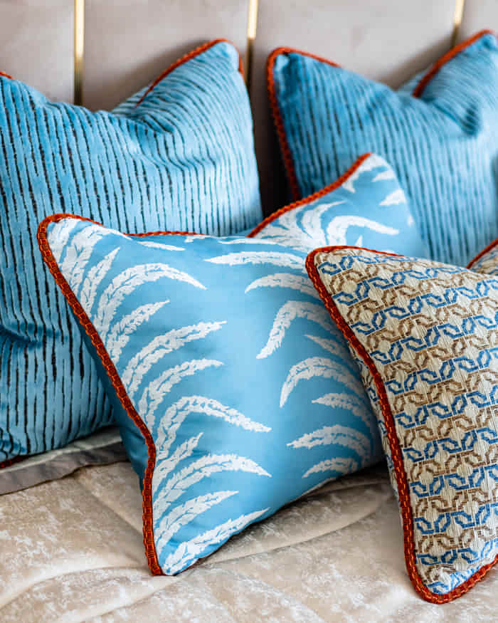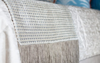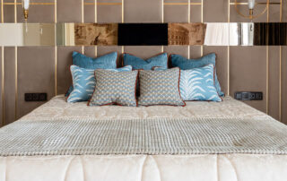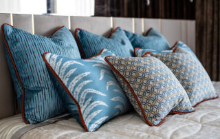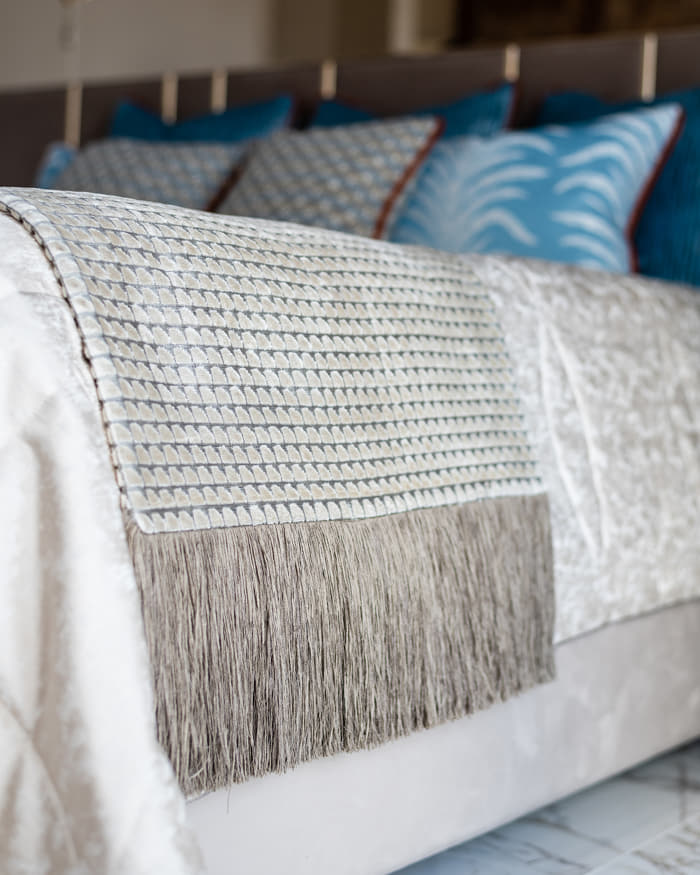 Но какими бы красивыми ни были шторы в спальне, они будут ещё лучше, если подобрать подходящий текстиль и для кровати. Покрывало из жемчужного сатина с авторской стёжкой и декоративные подушки из премиальных тканей от английской фабрики SANDERSON позволили создать по-настоящему уютную и роскошную спальню.