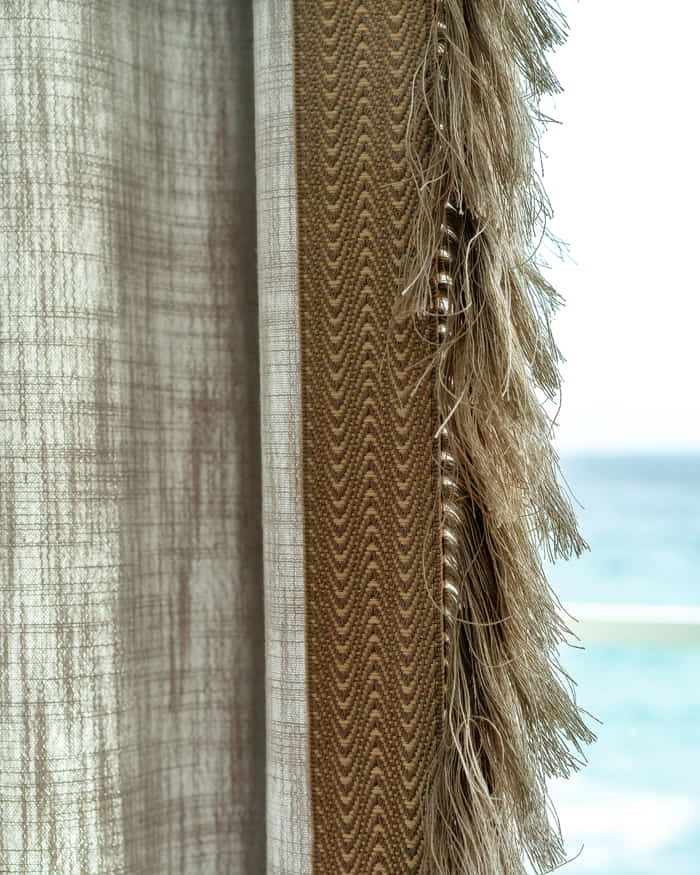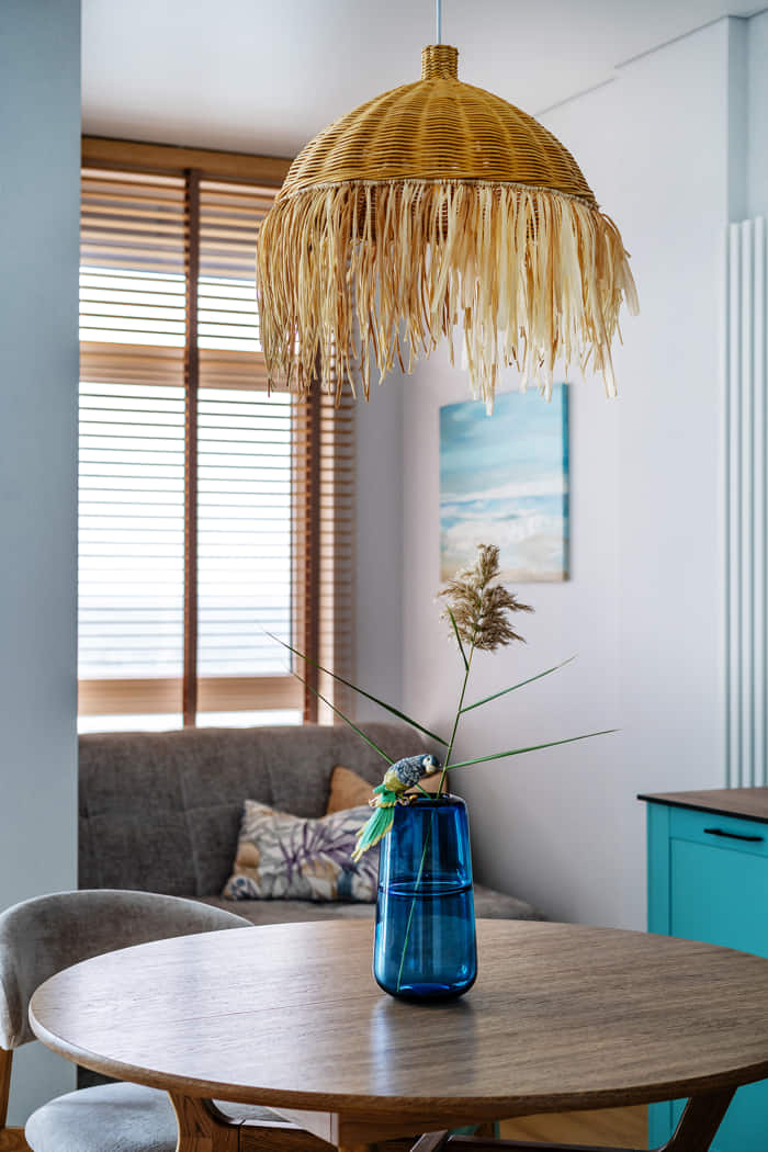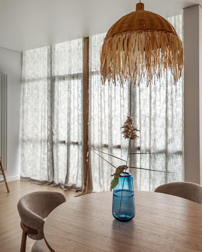 Изюминкой штор в гостиной стала длинная декоративная бахрома из рафии. Она поддерживает рукотворный соломенный абажур над обеденным столом, а ещё формирует необычный контур шторы.