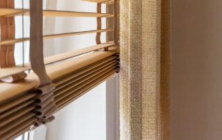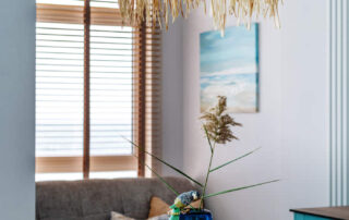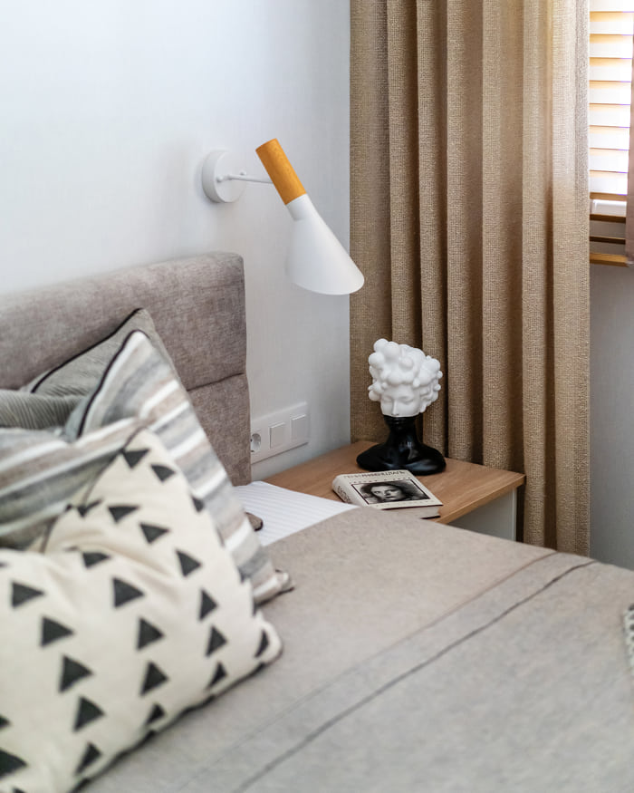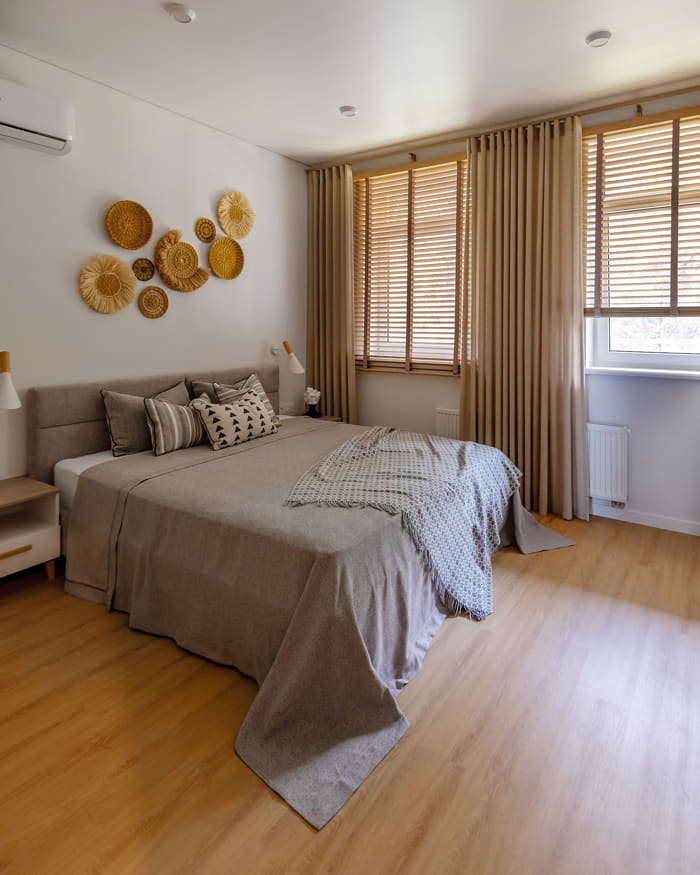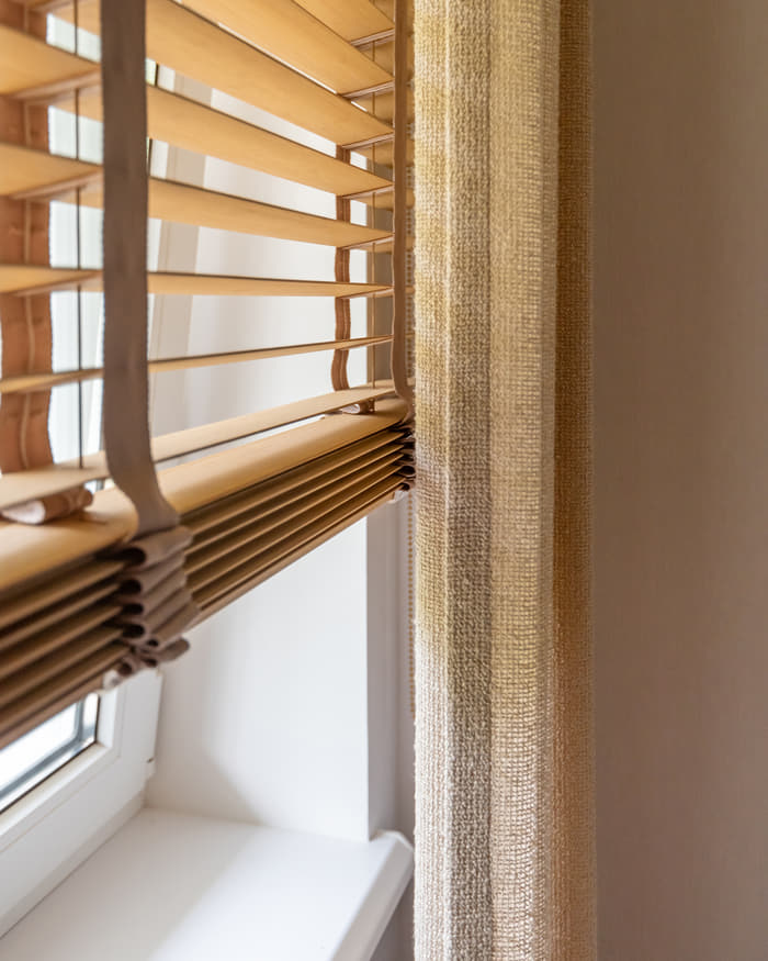 Чтобы сделать пространство легче я предложила отказаться от традиционных тюлей. А там, где всё таки нужен был рассеянный свет — использовала жалюзи из натурального дерева.