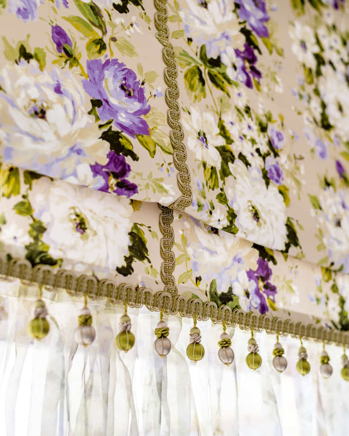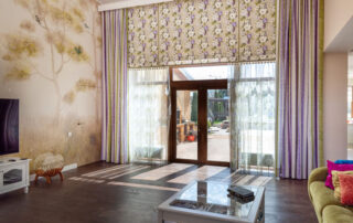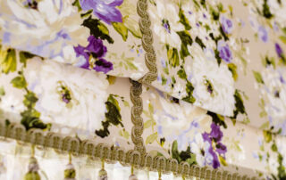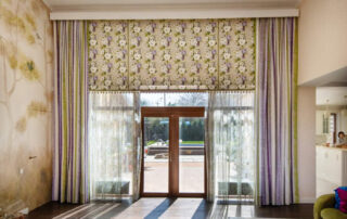 Крупный раппорт цветочного орнамента в римской шторе и широкая полоса на портьерах соответствуют масштабу комнаты, а имитация акварельного рисунка делает композицию легче и воздушнее.