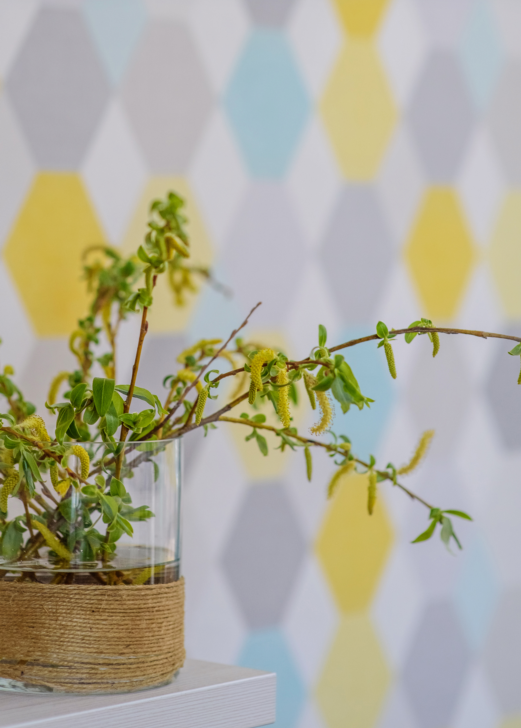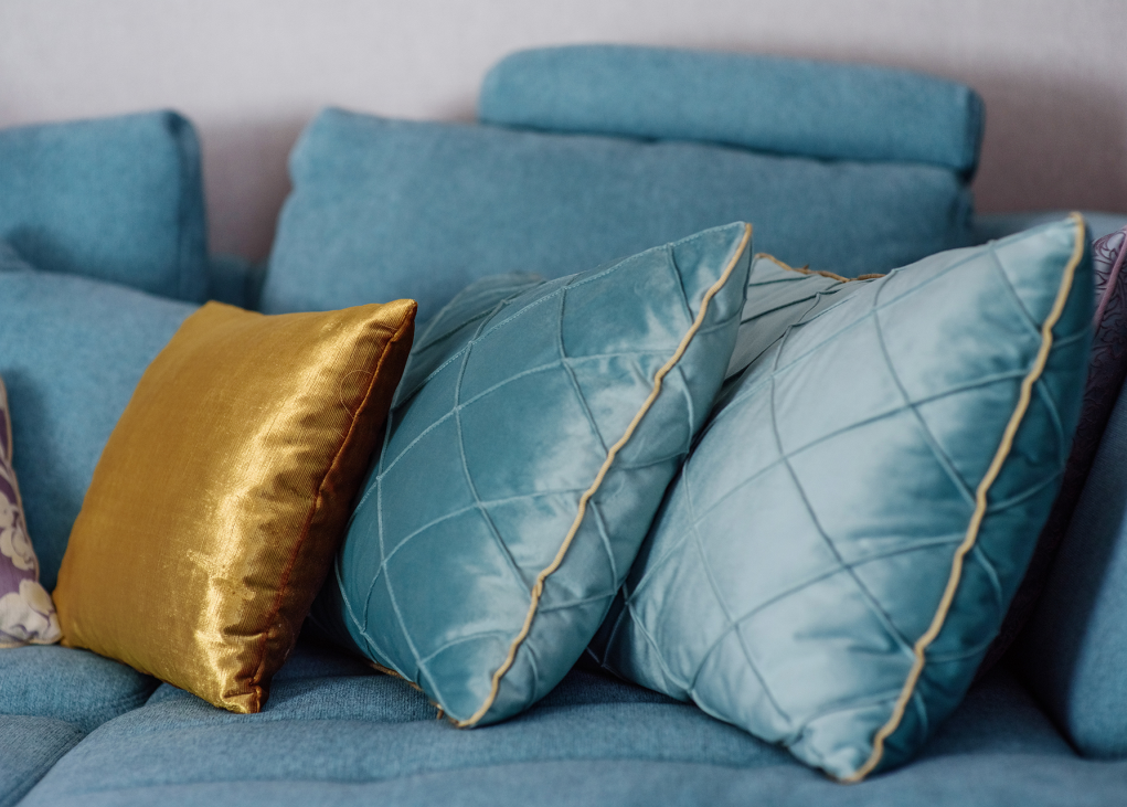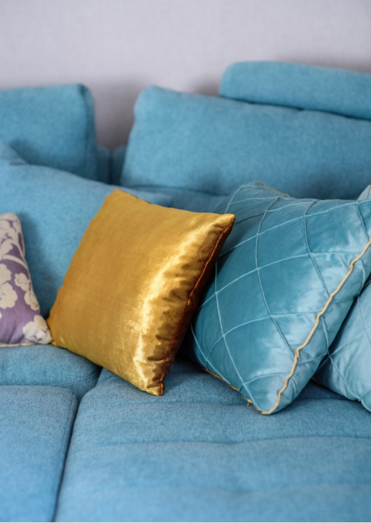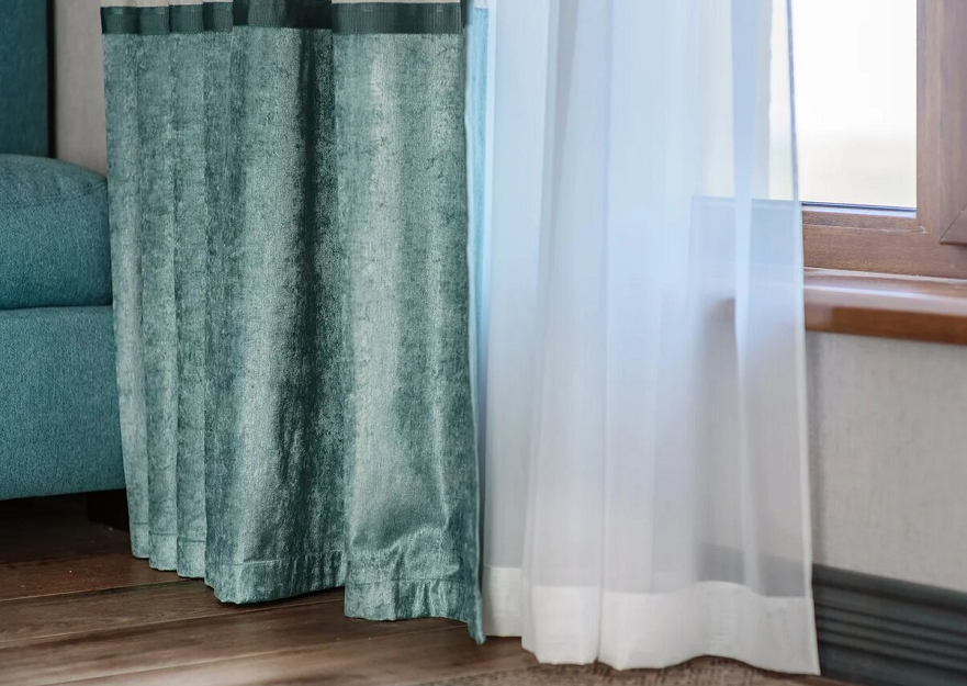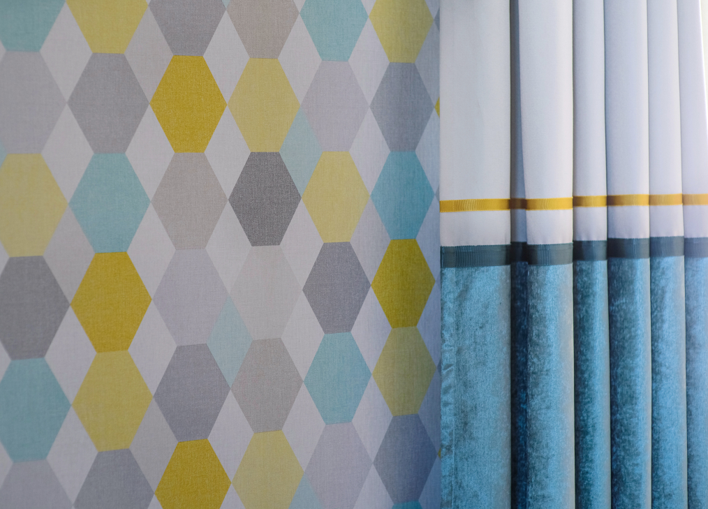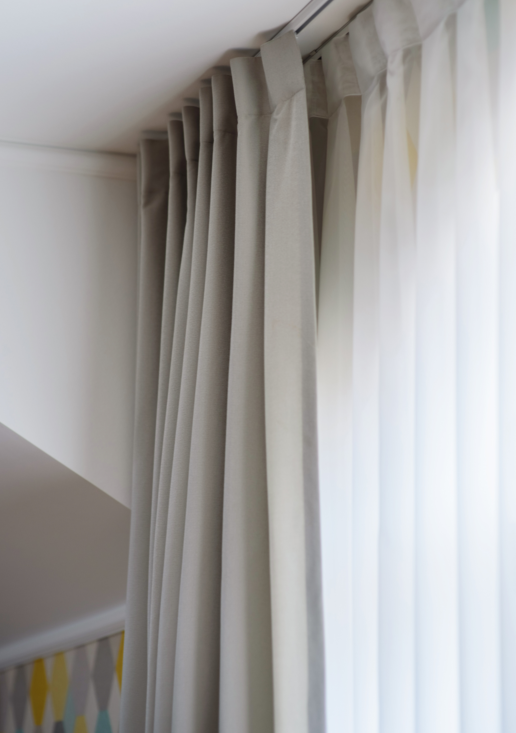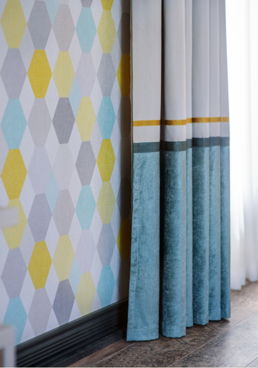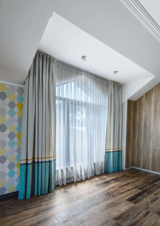 Заказчица хотела, чтобы в комнате было много света, легкости и воздуха. Мы подобрали портьерную ткань средней плотности в сложном жемчужно-сером оттенке, добавили к ней немного свежей бирюзы и тонкие графичные кантики. Складки на шторах заложили вручную — для того, чтобы в любом положении они выглядели аккуратно.