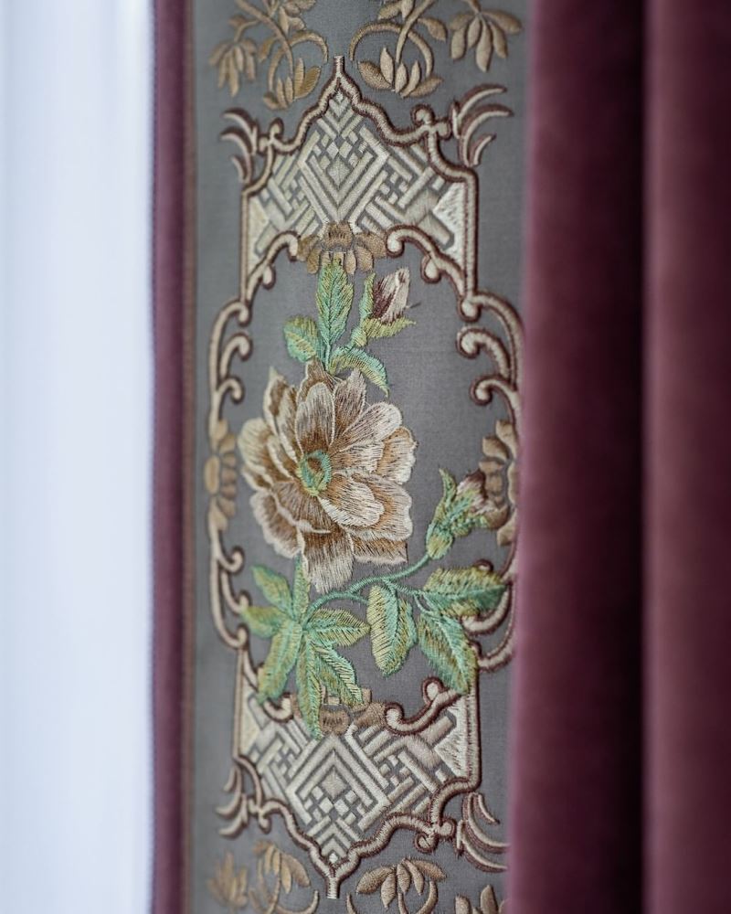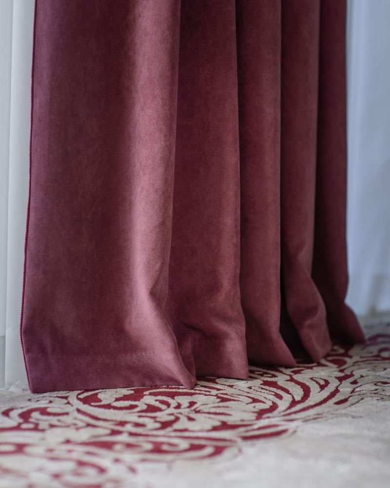 Для штор подобрали мягкий матовый шенилл цвета пыльной розы и украсили его роскошным атласным кантом.