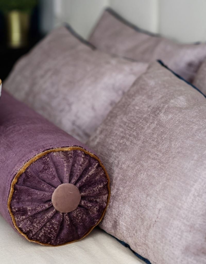 Но настоящее буйство красок добавляют разные по фактуре и форме подушки! Лиловые оттенки мягкой ткани, черно-белые орнаменты.