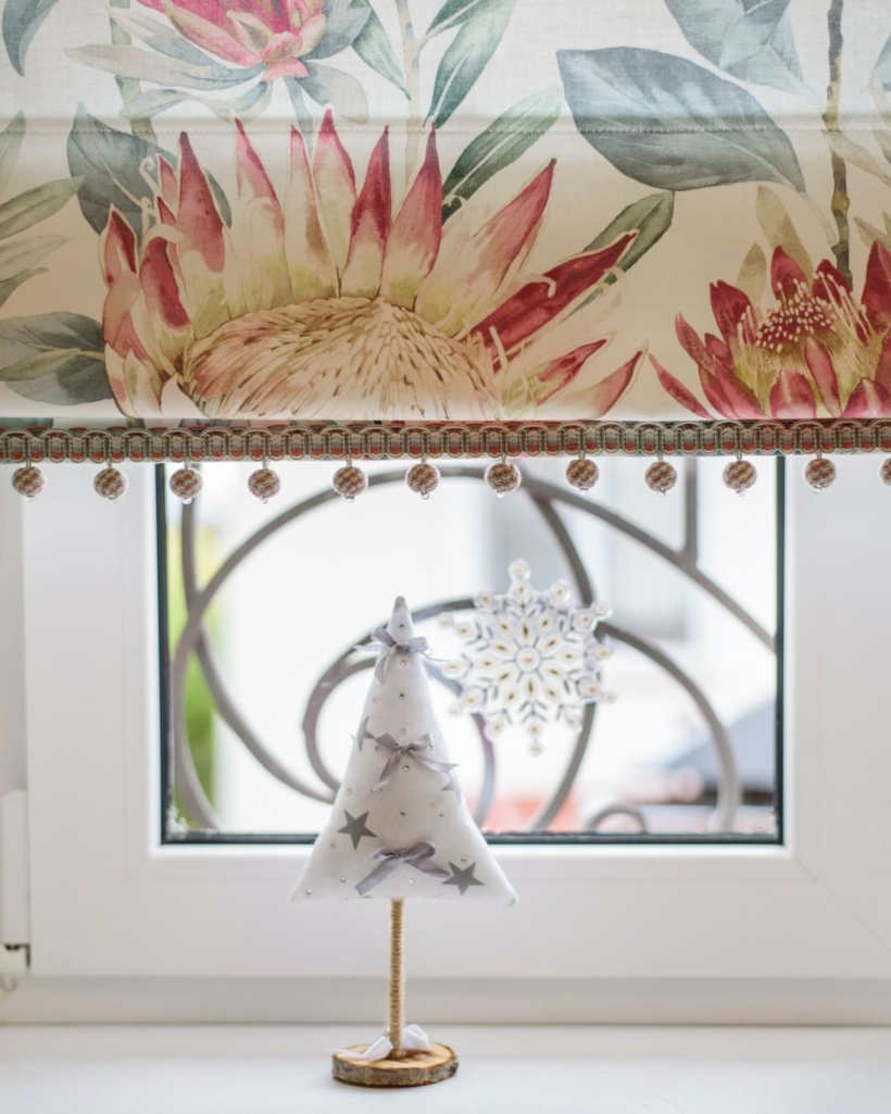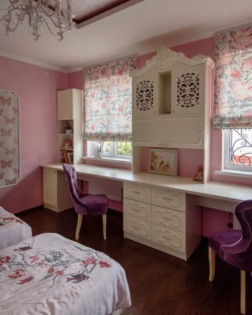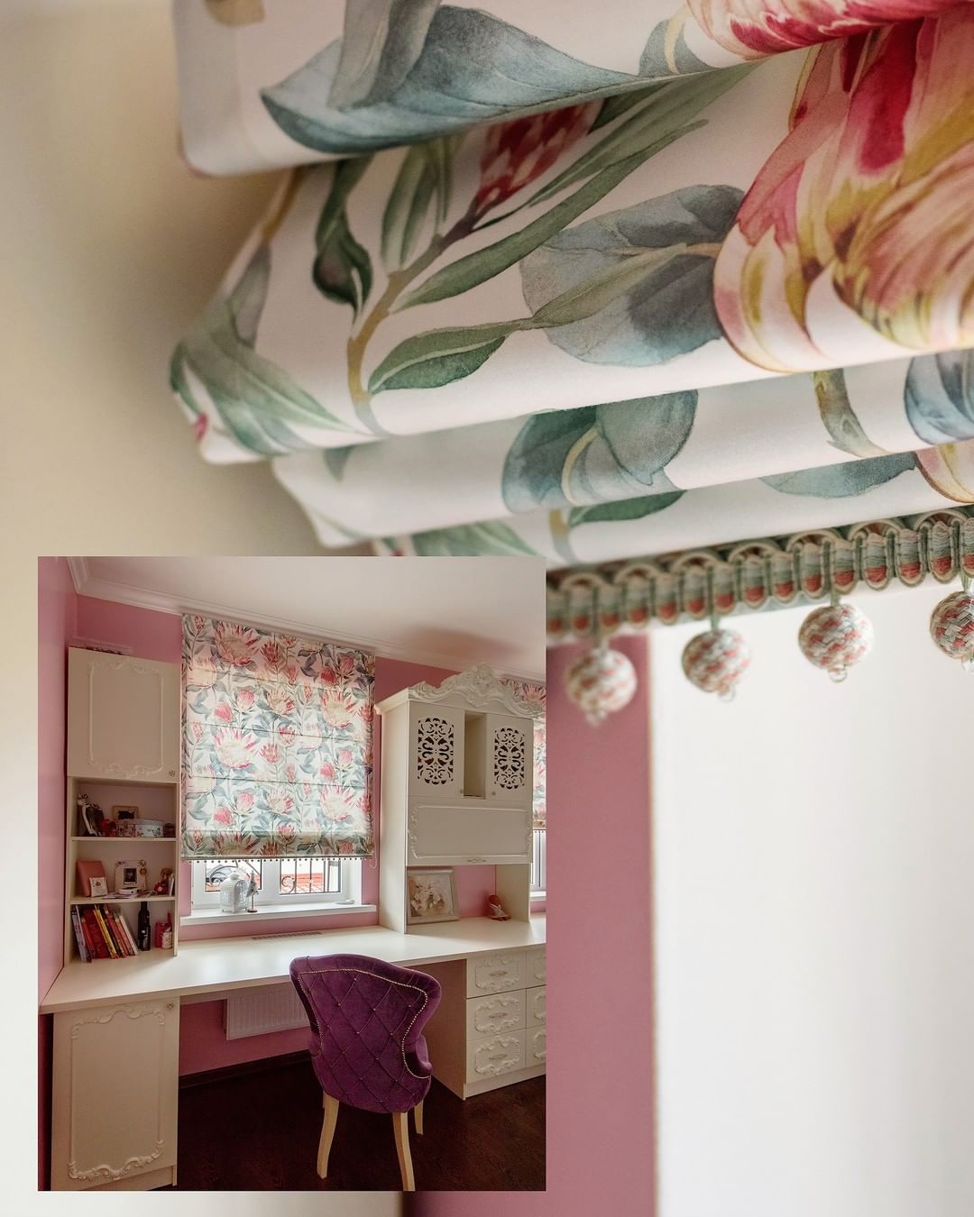 Так получилось в этой детской комнате для двух девочек. Мисс Штора предложила ткань с цветущими артишоками и дополнила ее бахромой с текстильными шариками.
