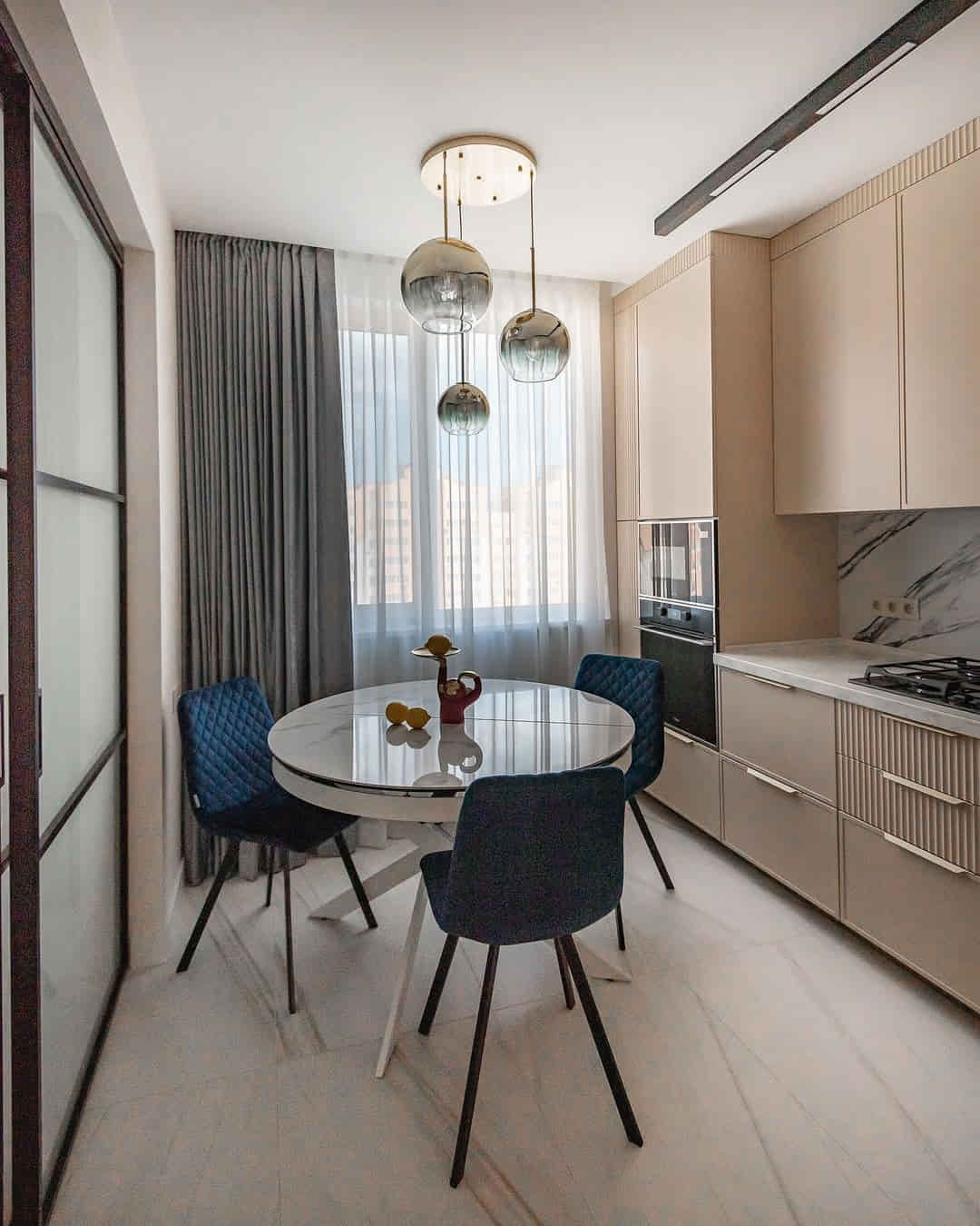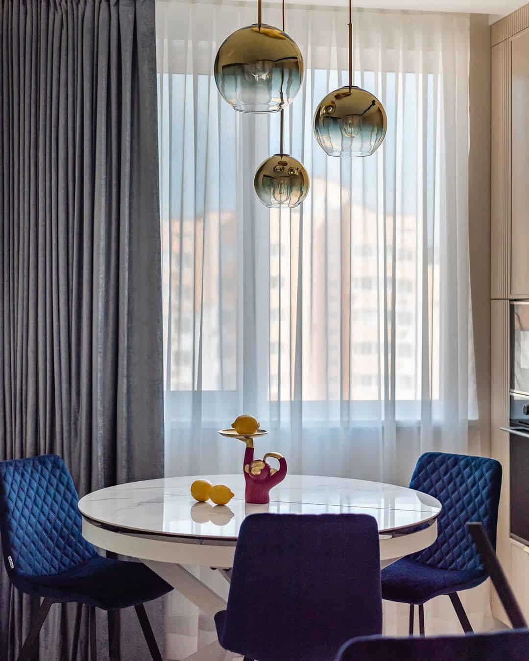 Сизые или цвета предгрозового летнего неба? Как бы назвали цвет штор в этой кухне?