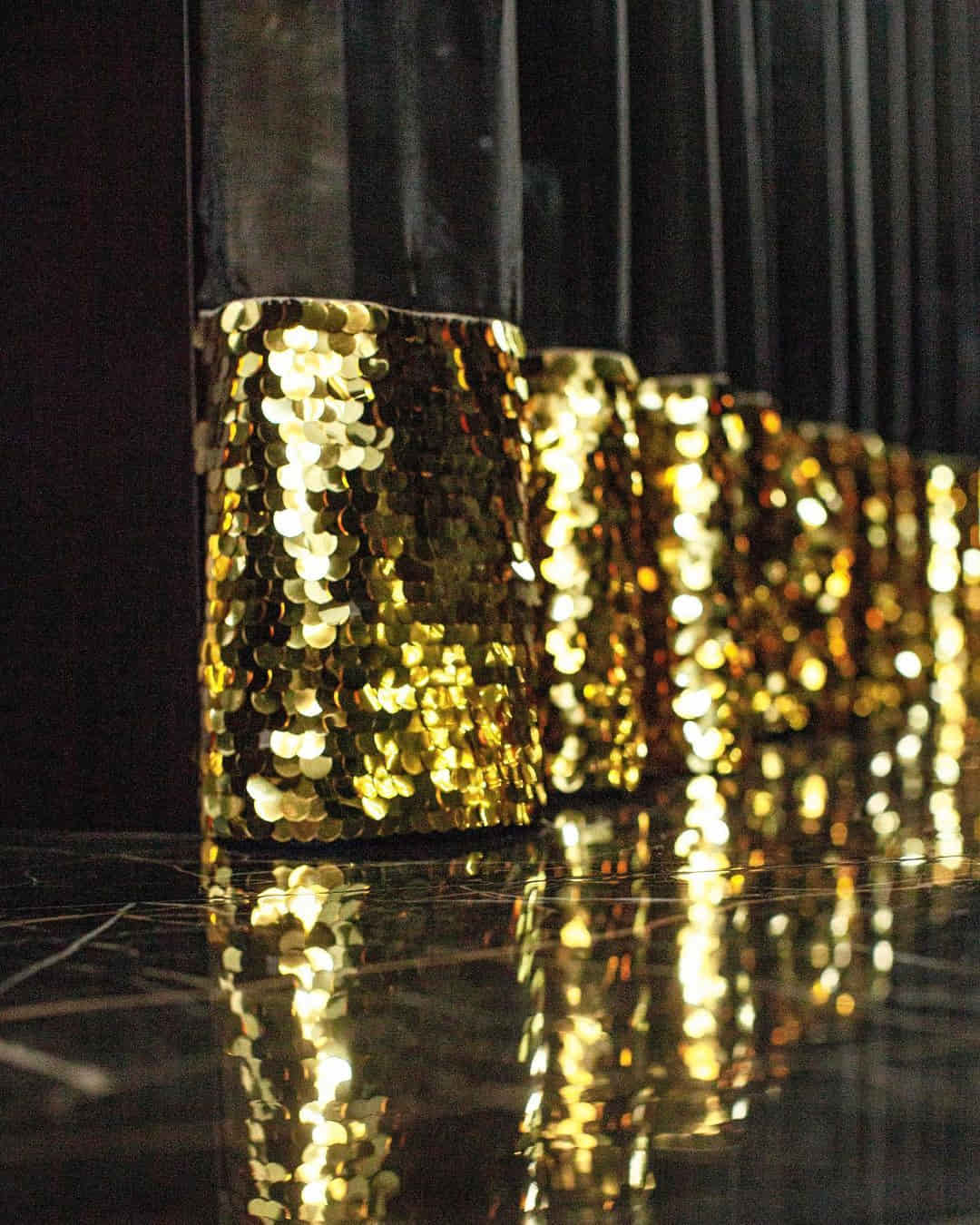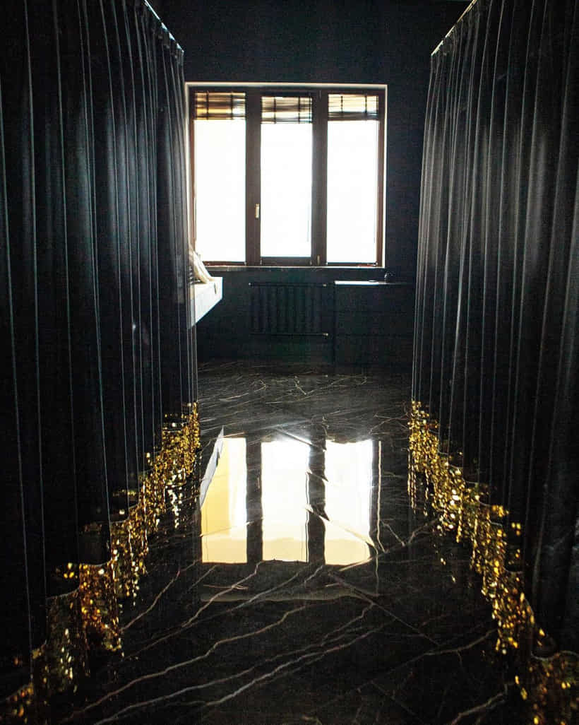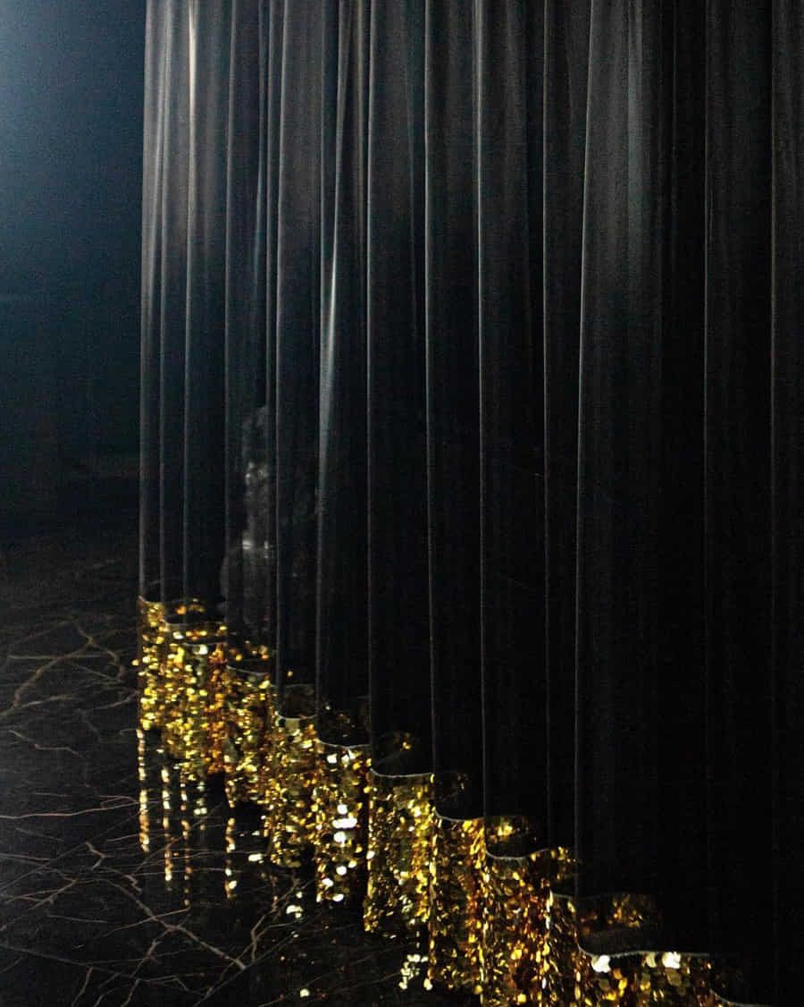 Просмотрите, насколько артистичным и эффектным получилось пространство, в том числе и благодаря сочетанию черного цвета ткани и золотистых вкраплений металлизированных чешуек