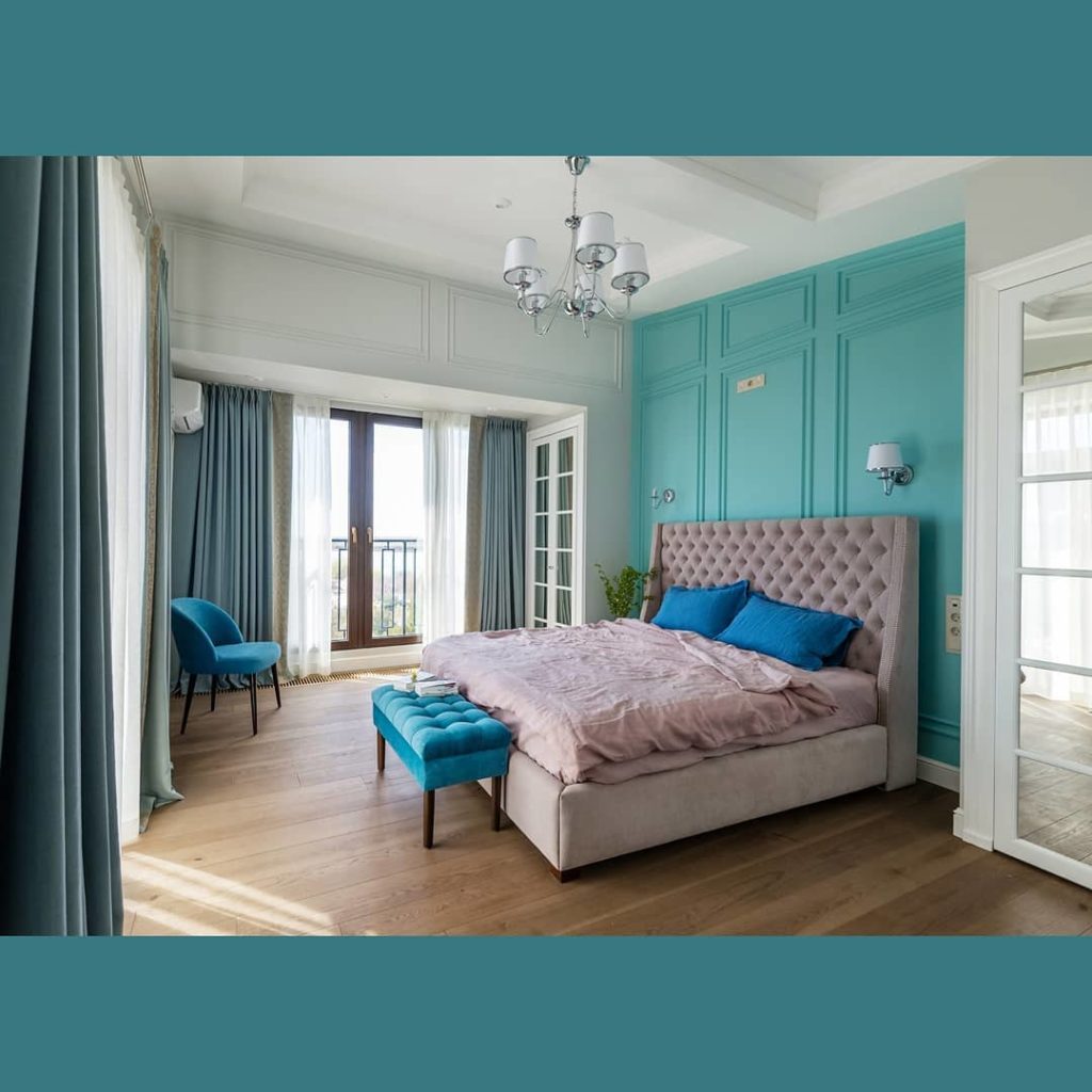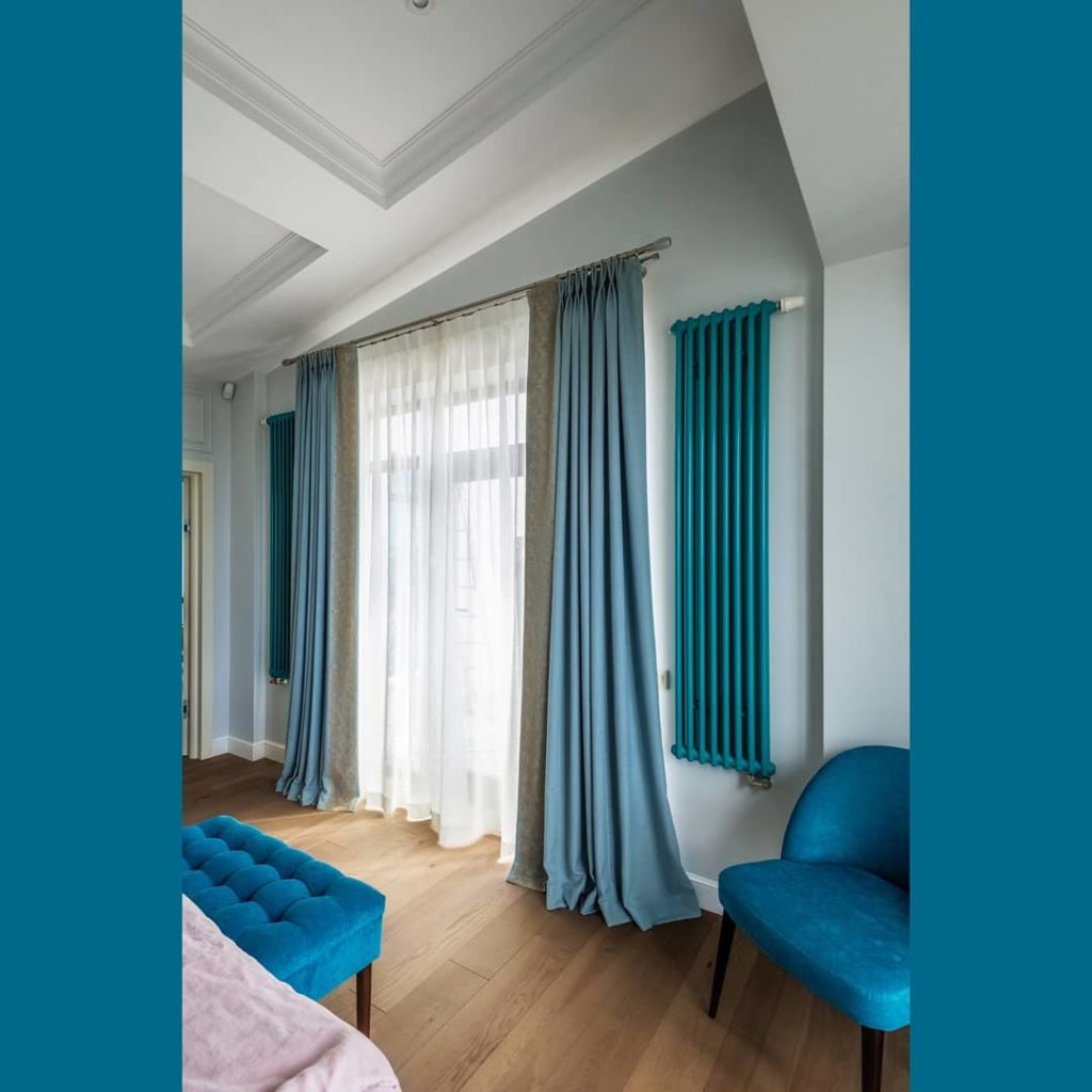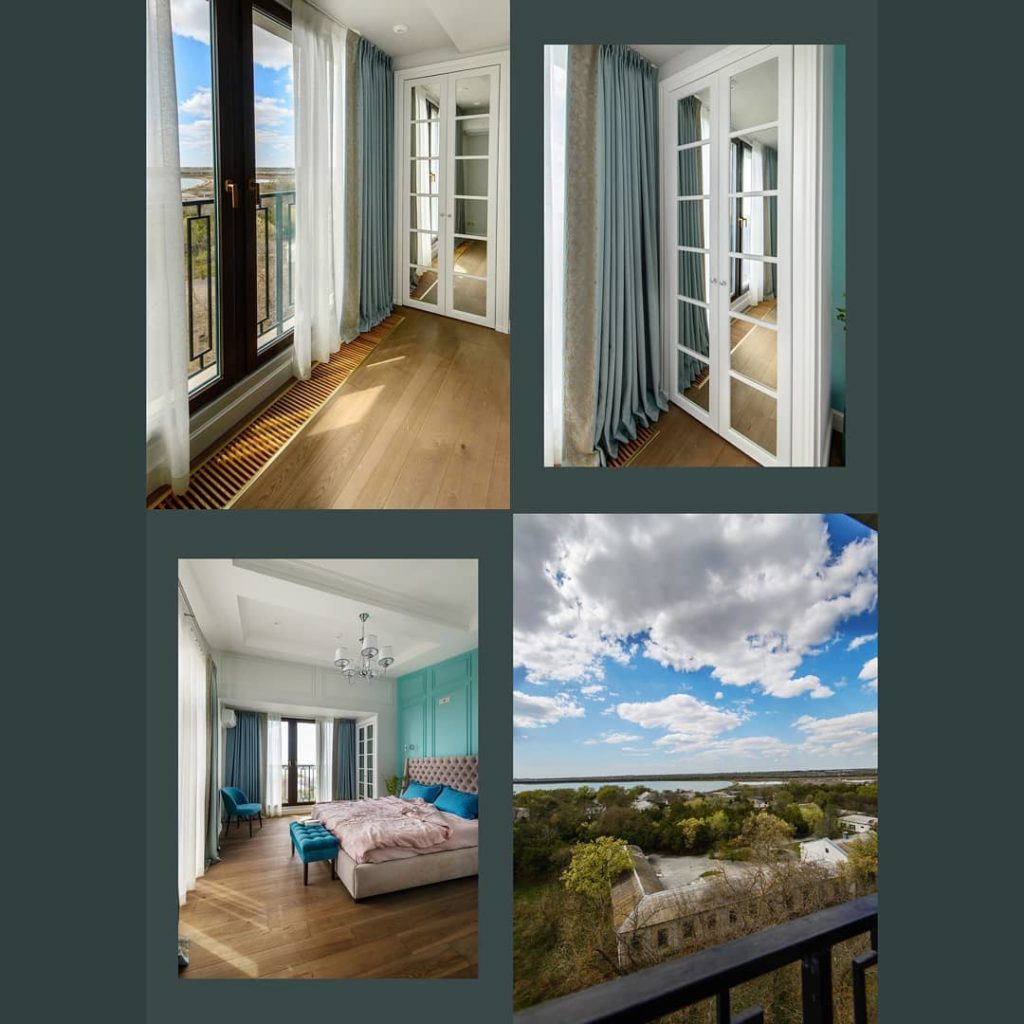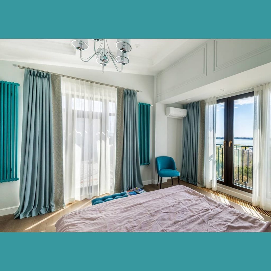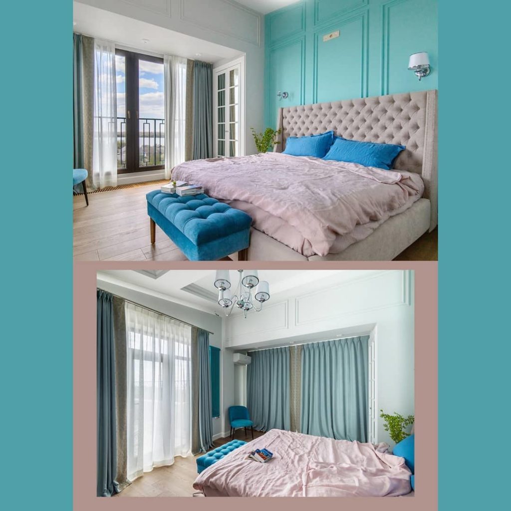 Вы только посмотрите на эту красоту: шторы из льна сложного голубого оттенка обрамляют невероятный вид из окна и кажется, что идеально сочетаются с цветом облаков. Чтобы добавить спальне роскошной нежности (не путать с нежной мимимишностью), мы подобрали к шторам французское кружево с вышивкой тонким шелковистым шнуром.