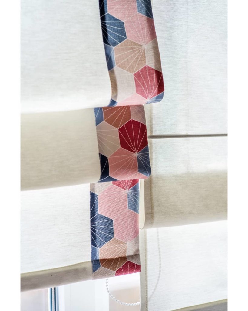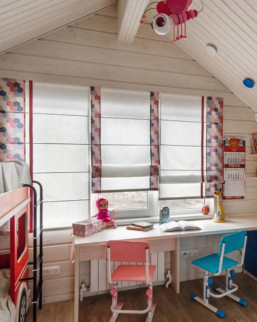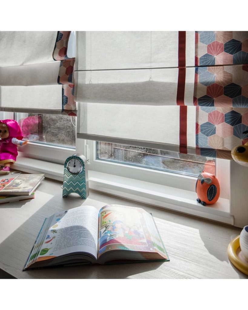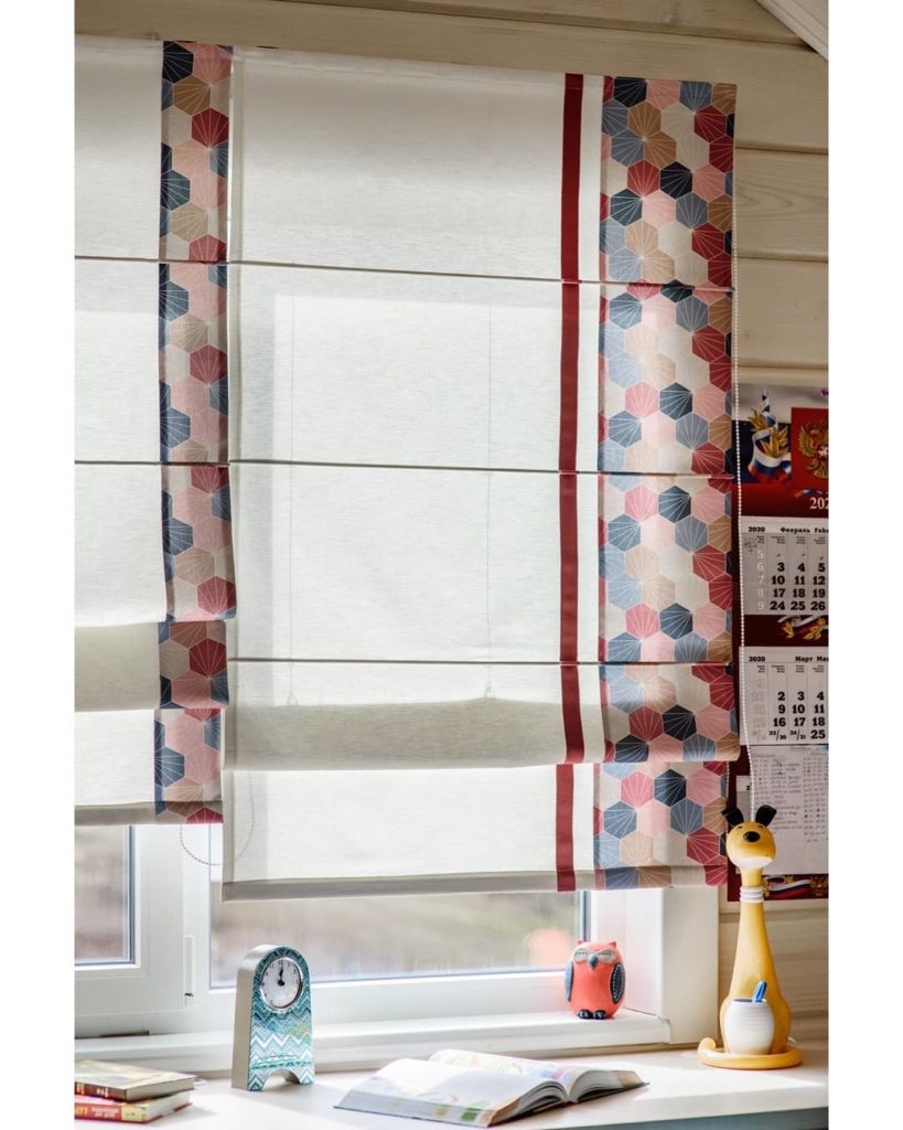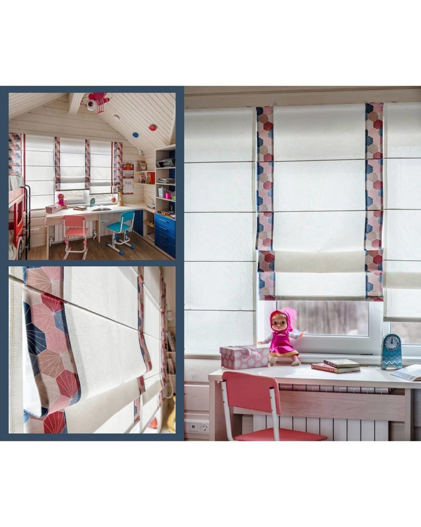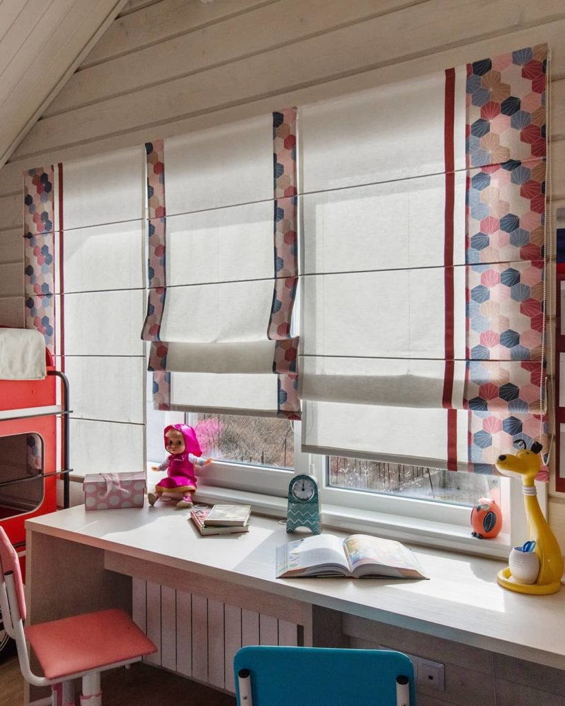 У второго окна расположена рабочая зона. Здесь на окне римские шторы из хлопка, также украшенные «сотами». В этой части комнаты текстиль получился в меру сдержанный, но не лишенный ярких элементов. Соты, однозначно, задают динамику в интерьере. К тому же, шестиугольник – геометрическая фигура, которая располагает к гармонии и порядку.