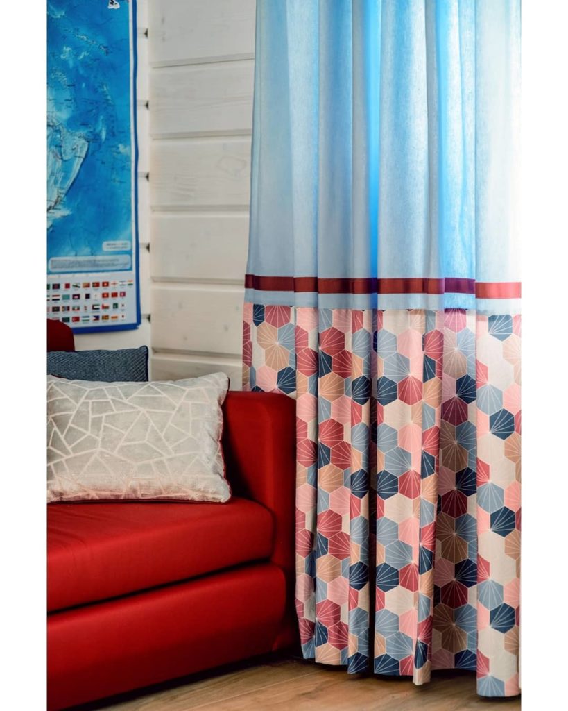 Окно на солнечной стороне мы, естественно, не могли оставить без лёгкого тюля, который преломляет и мягко рассеивает солнечные лучи. Дополнили композицию портьерами средней плотности из натурального хлопка. И сделали широкий горизонтальный кант из ткани с ярким геометрическим рисунком.