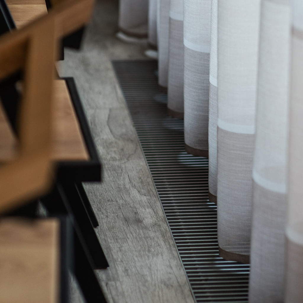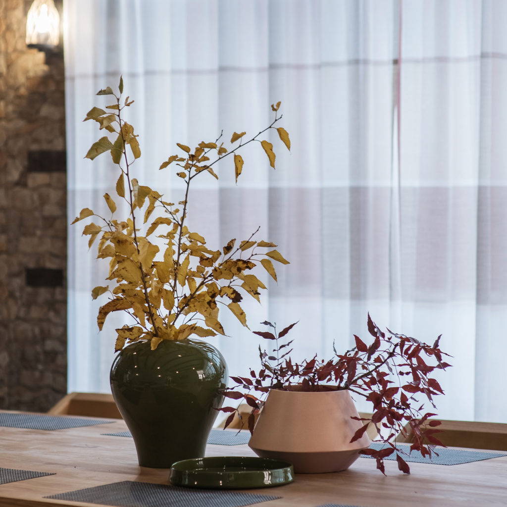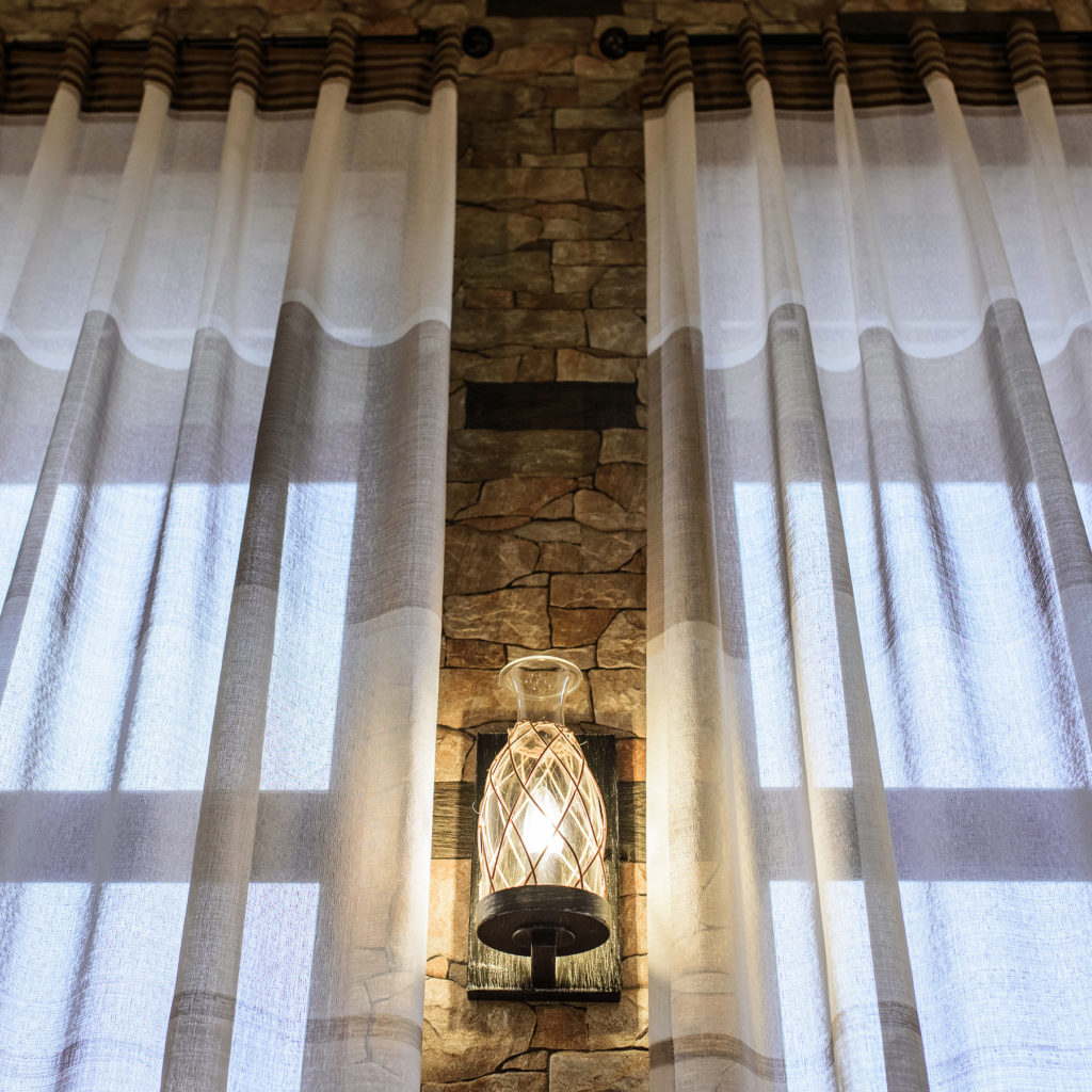 Большие панорамные окна мы решили оформить полупрозрачным тюлем — сквозь разреженную основу ткани просматриваются силуэты гор. Ну а если захочется полюбоваться пейзажами — не проблема. Все шторы состоят из двух частей — можно просто раздвинуть их от центра в стороны!