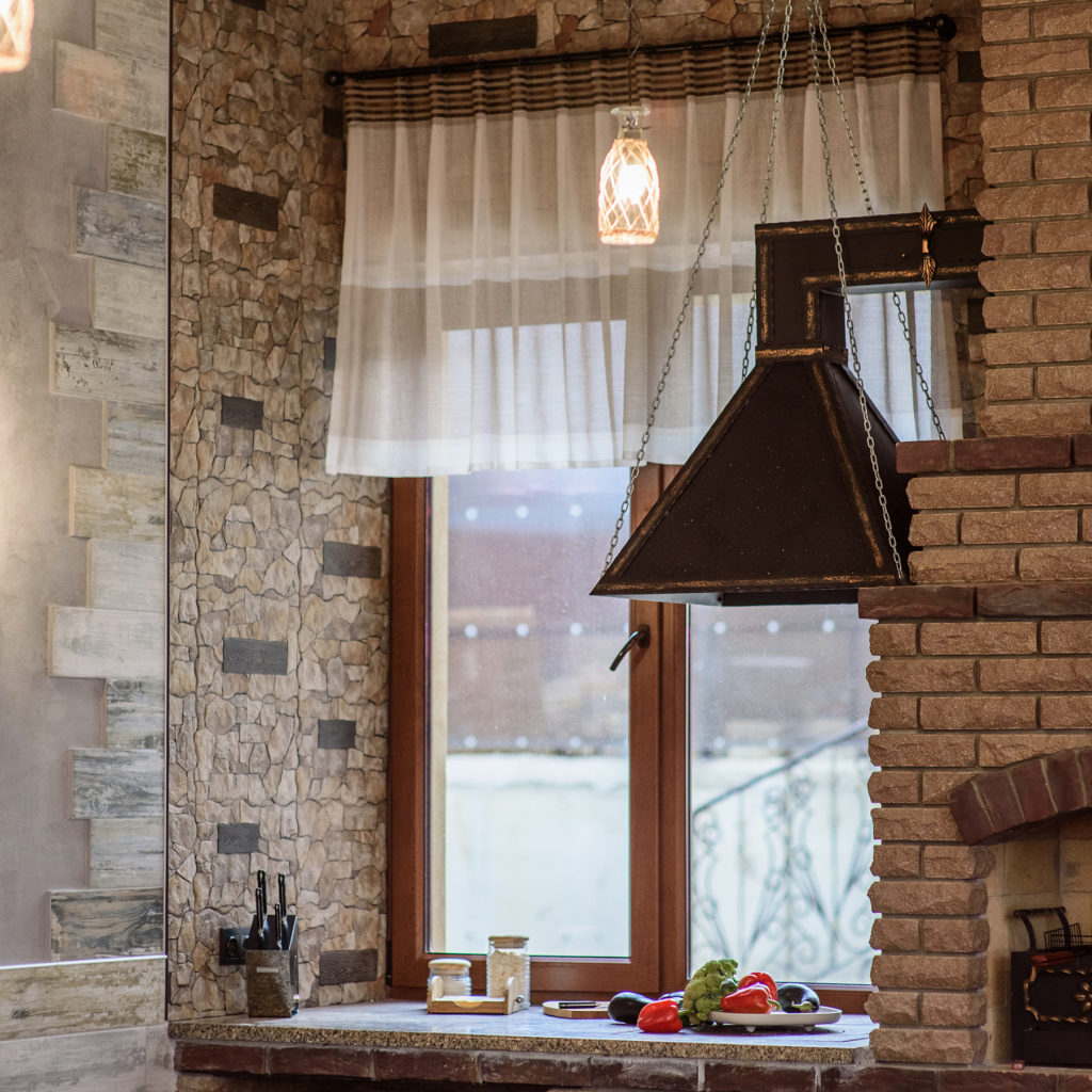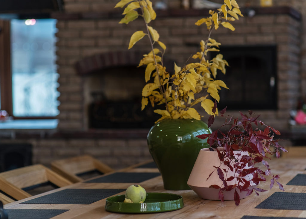 Ура-ура, начинаем делиться новыми фотографиями! Мы уже показывали некоторые кадры, а теперь пришло время рассказать подробнее. На фото – столовая в загородном доме, с фактурной отделкой, деревянной мебелью, настоящей печкой, кованными элементами.
