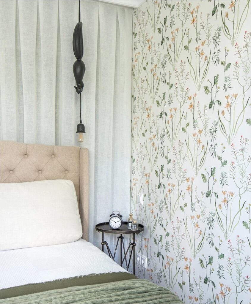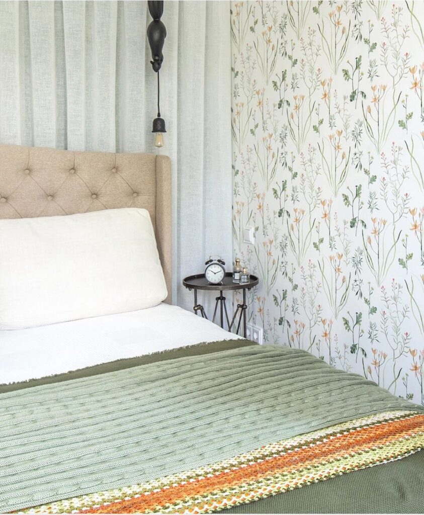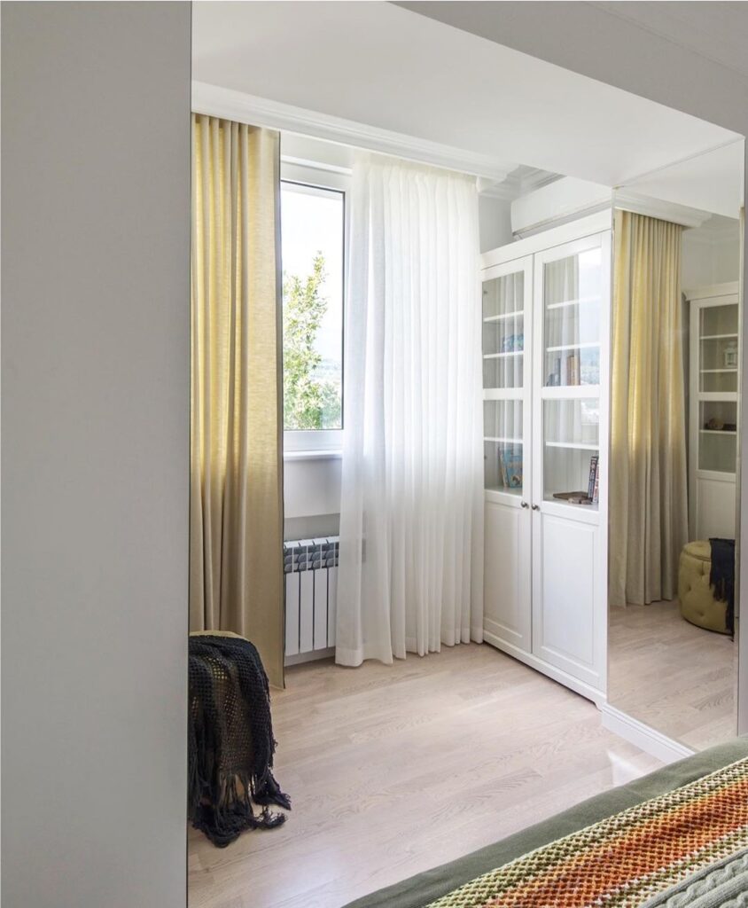 Продуманная и функциональная система хранения располагается за изголовьем кровати, а чтобы обеспечить визуальную легкость и удобный доступ, Татьяна спроектировала полупрозрачную штору вместо дверей (тот случай, когда дешевле, значит лучше, если вы понимаете о чем мы). ☺️