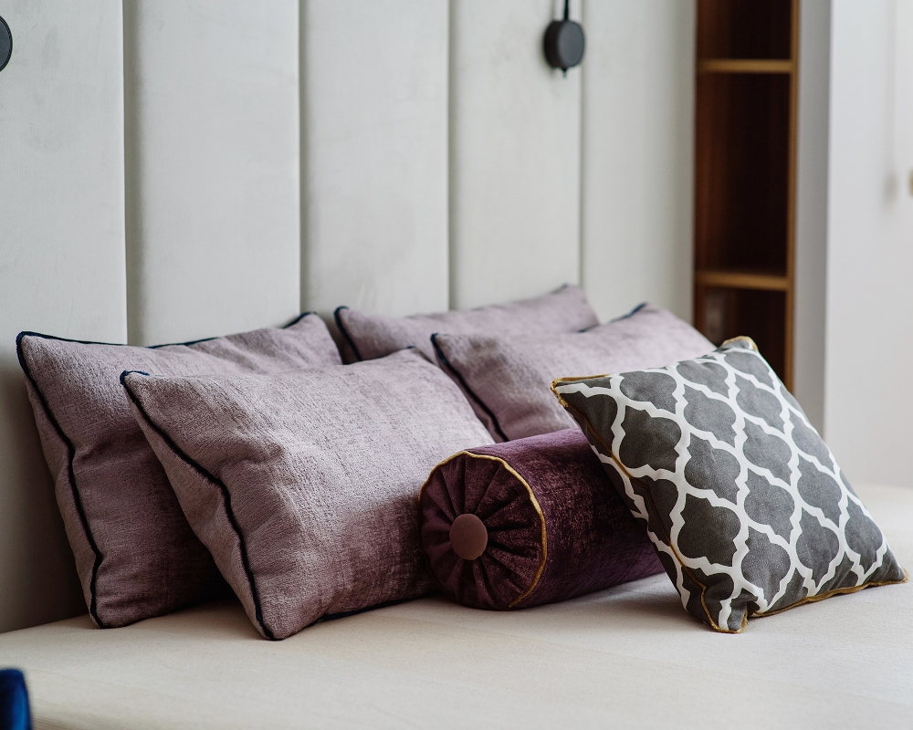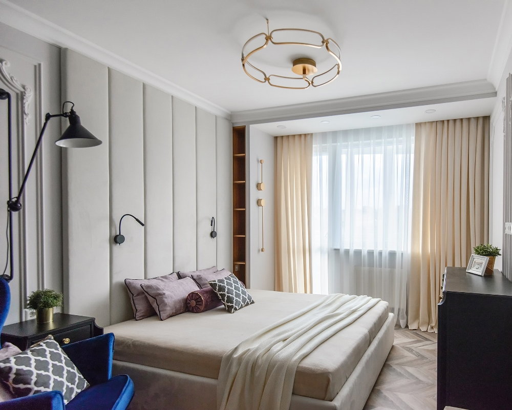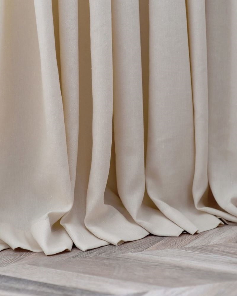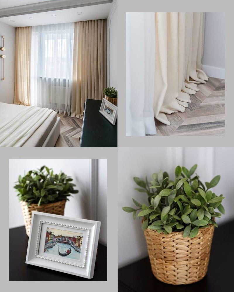 Спокойные мягкие тона гармонично сочетаются с изголовьем кровати и стенами. Струящаяся драпировка портьеры особенно красива в солнечных лучах.