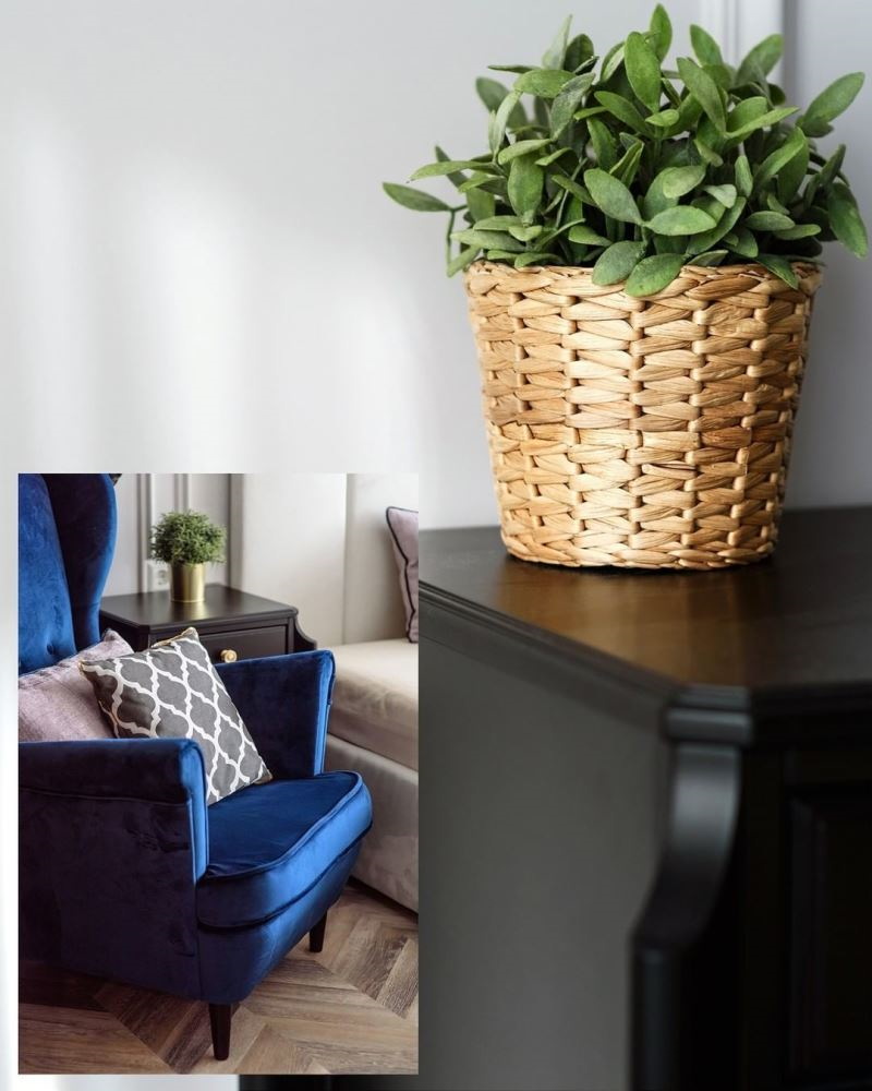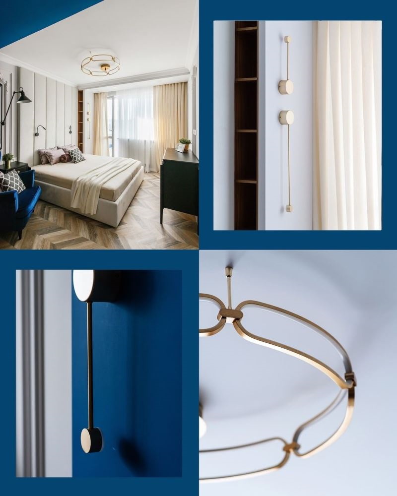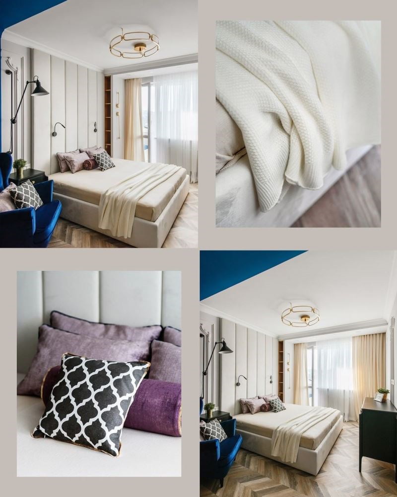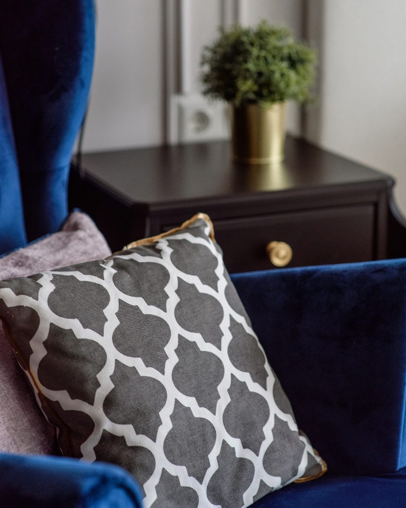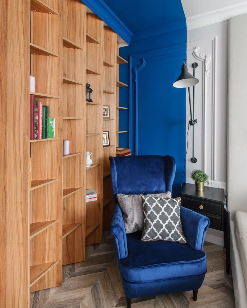 На фото – стильная и жизнерадостная спальня. Яркие детали интерьера притягивают взгляд – синее бархатное кресло, темный деревянный комод.