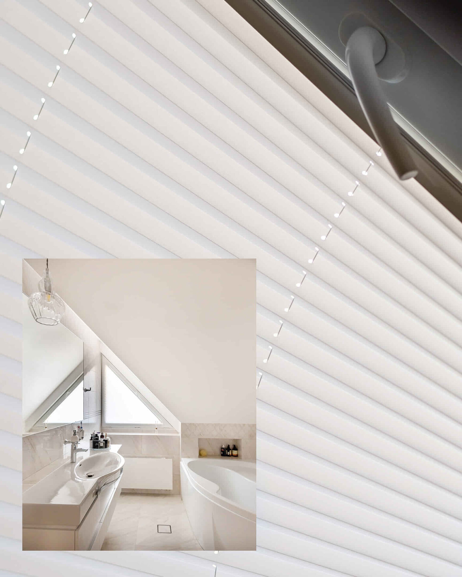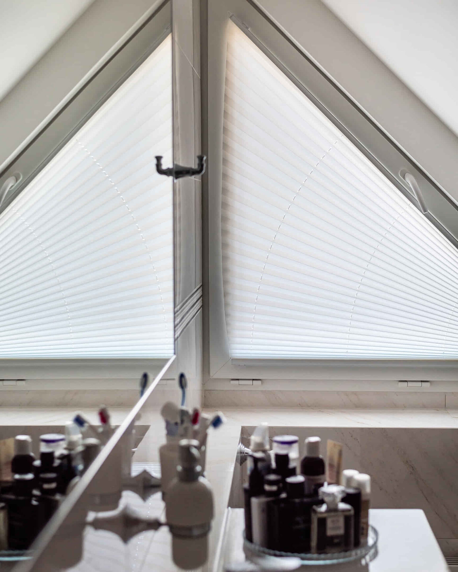 Лаконичная ванная комната в проекте #миссштора_геометрия_пространства предполагала минималистичное оформление окна. Белоснежные шторы плиссе с четким горизонтальным ритмом складочек — и всё!